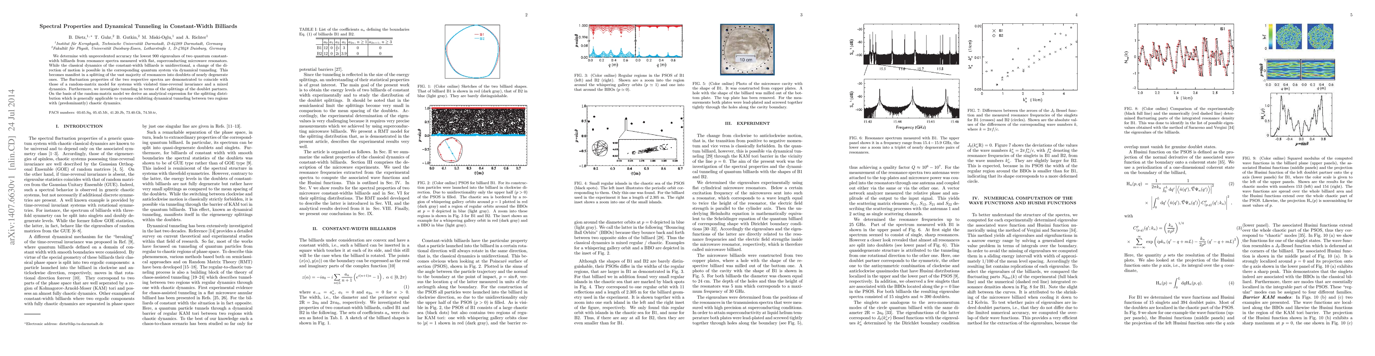 This paper measures the lowest 900 eigenvalues of quantum constant-width billiards using superconducting microwave resonators, revealing dynamical tunneling through resonance splitting. The spectral properties align with a random-matrix model for systems with mixed dynamics and violated time-reversal invariance.