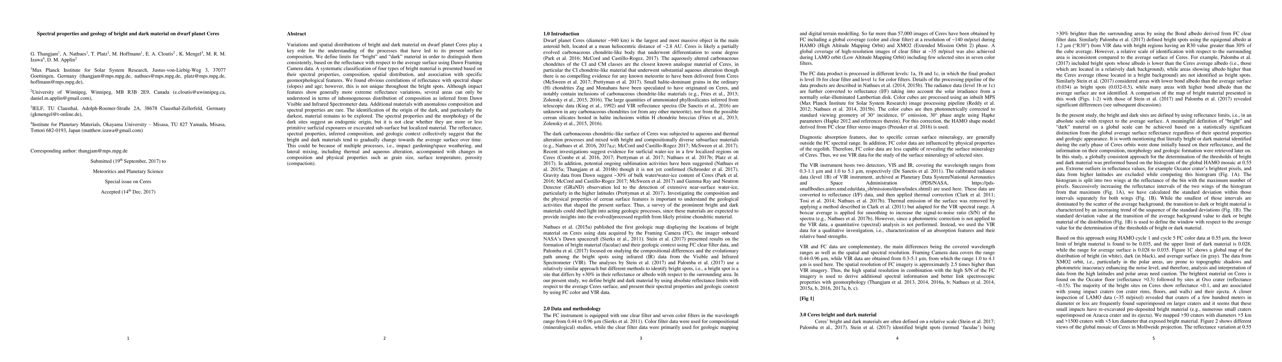 This paper investigates the spectral properties and geological context of bright and dark materials on Ceres, identifying four types of bright material based on reflectance and spectral features. The study suggests that these materials evolve over time through processes like impact gardening, space weathering, and lateral mixing, while the origin of dark material remains uncertain but hints at an endogenic source.