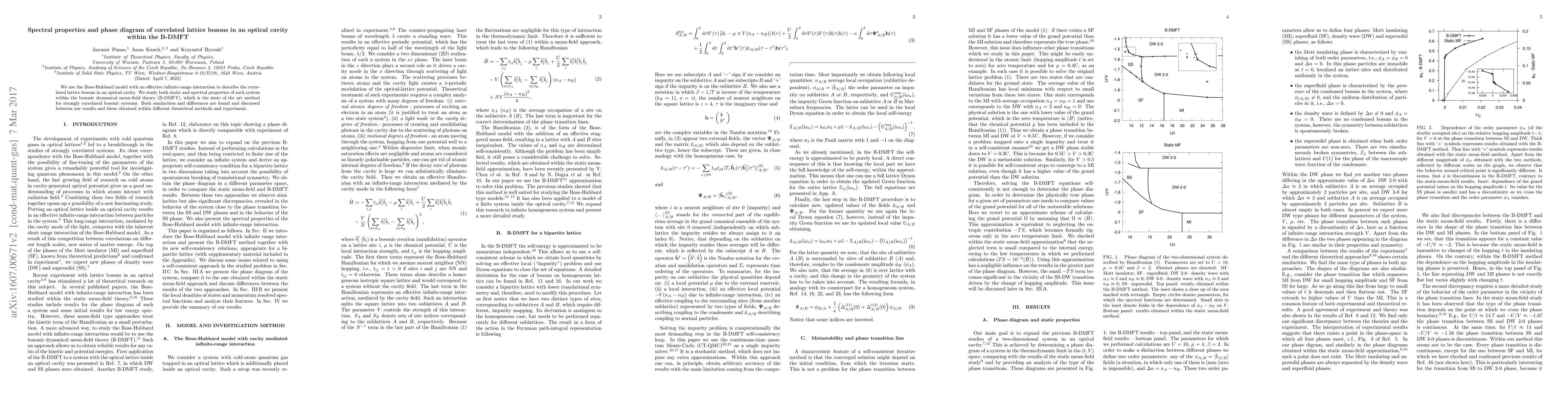 Summary: The study investigates spectral properties and phase diagrams of correlated lattice bosons in an optical cavity using the Bose-Hubbard model within B-DMFT. Results reveal both similarities and differences compared to other theoretical methods and experiments.