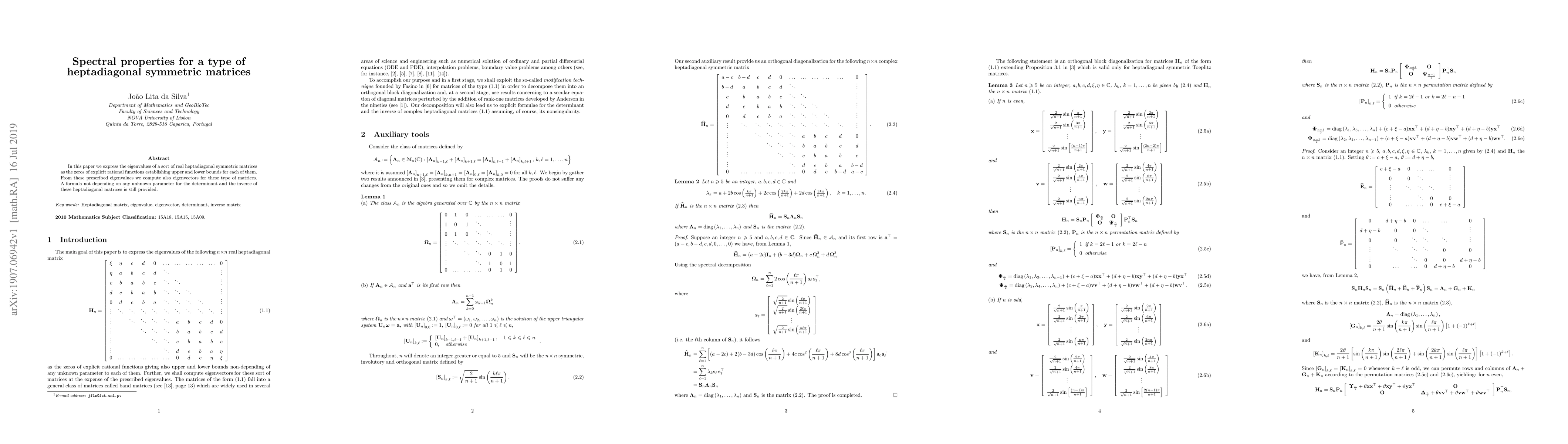 This paper derives explicit rational functions for the eigenvalues of a specific type of real heptadiagonal symmetric matrices, establishing upper and lower bounds for each. It also provides a formula for the determinant and inverse of these matrices, independent of any unknown parameters.
