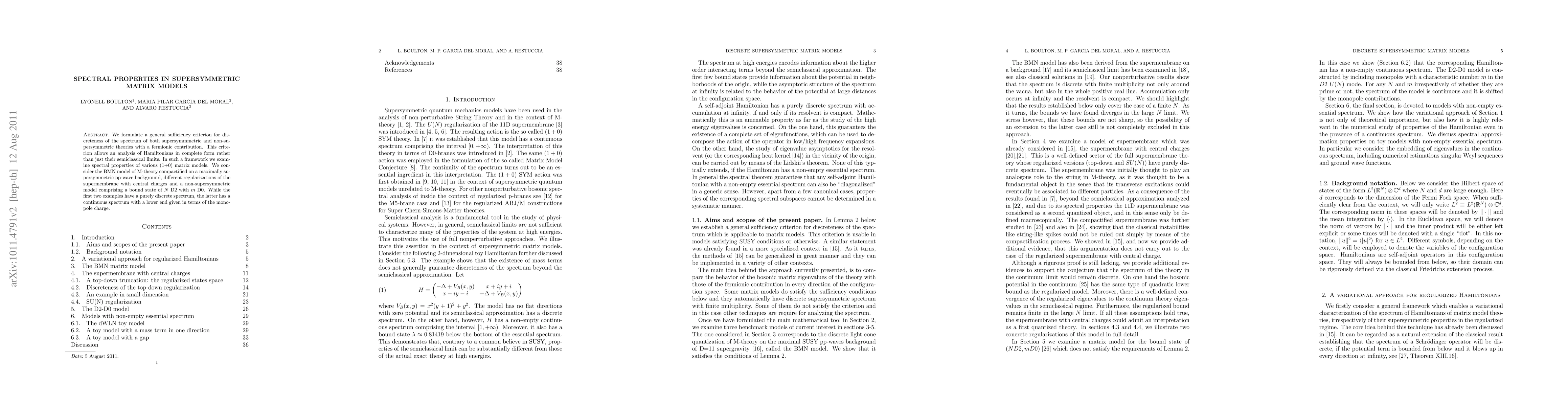 We formulate a general sufficiency criterion for discreteness of the spectrum of both supersymmmetric and non-su-persymmetric theories with a fermionic contribution. This criterion allows an analysis of Hamiltonians in complete form rather than just their semiclassical limits. In such a framework we examine spectral properties of various (1+0) matrix models. We consider the BMN model of M-theory compactified on a maximally supersymmetric pp-wave background, different regularizations of the supermembrane with central charges and a non-supersymmetric model comprising a bound state of N D2 with m D0. While the first two examples have a purely discrete spectrum, the latter has a continuous spectrum with a lower end given in terms of the monopole charge.