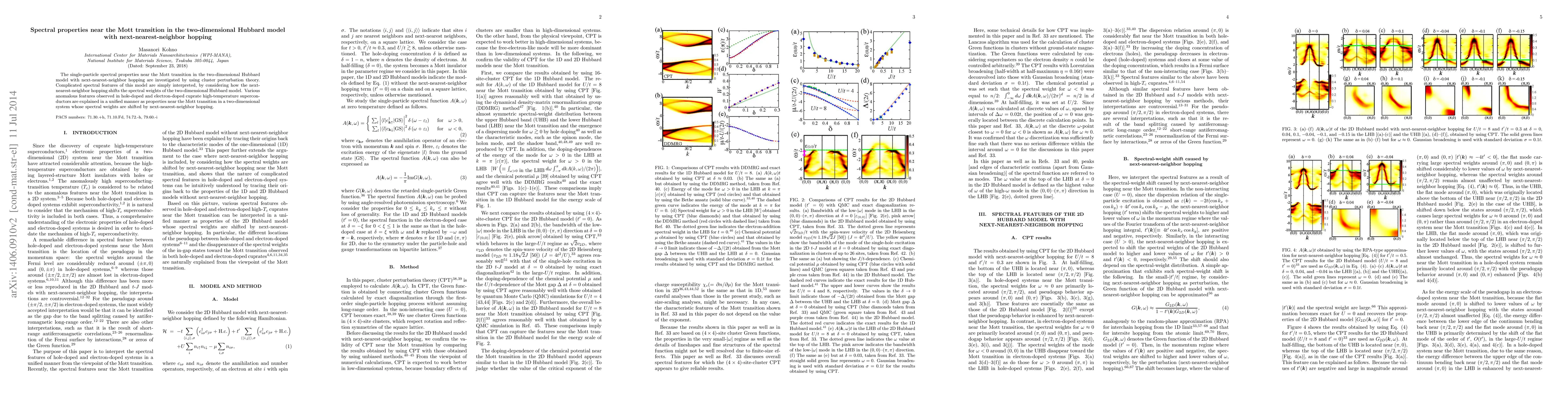 This paper investigates the spectral properties near the Mott transition in the two-dimensional Hubbard model with next-nearest-neighbor hopping using cluster perturbation theory. It explains various anomalous features in cuprate superconductors as unified properties near the Mott transition due to the shift in spectral weights caused by next-nearest-neighbor hopping.