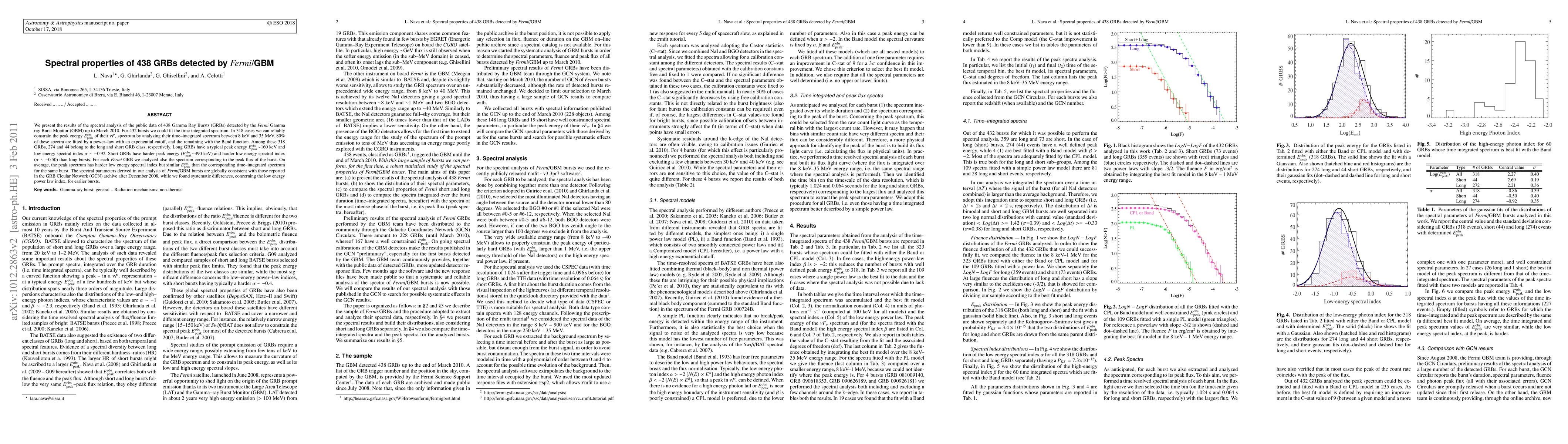 This study analyzes the spectral properties of 438 Gamma Ray Bursts (GRBs) detected by the Fermi Gamma ray Burst Monitor (GBM) up to March 2010, finding that 80% fit a power law with an exponential cutoff. Long GRBs typically have a peak energy of 160 keV, while short GRBs have a peak energy of 490 keV.