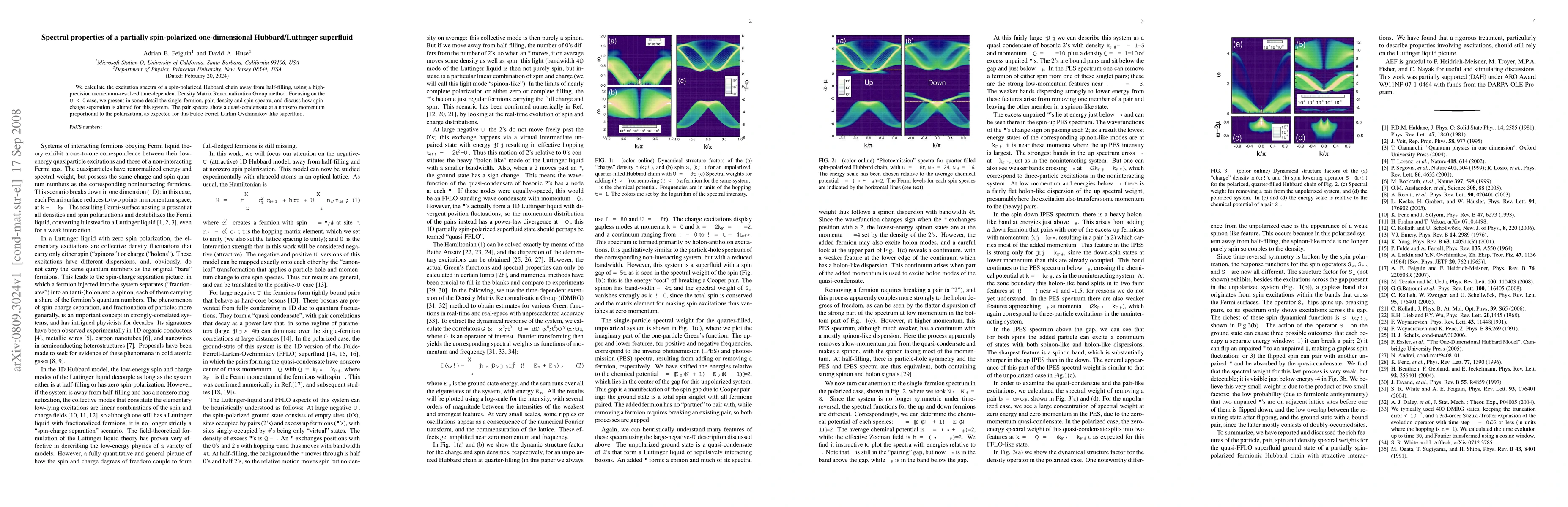 We calculate the excitation spectra of a spin-polarized Hubbard chain away from half-filling, using a high-precision momentum-resolved time-dependent Density Matrix Renormalization Group method. Focusing on the U<0 case, we present in some detail the single-fermion, pair, density and spin spectra, and discuss how spin-charge separation is altered for this system. The pair spectra show a quasi-condensate at a nonzero momentum proportional to the polarization, as expected for this Fulde-Ferrel-Larkin-Ovchinnikov-like superfluid.
