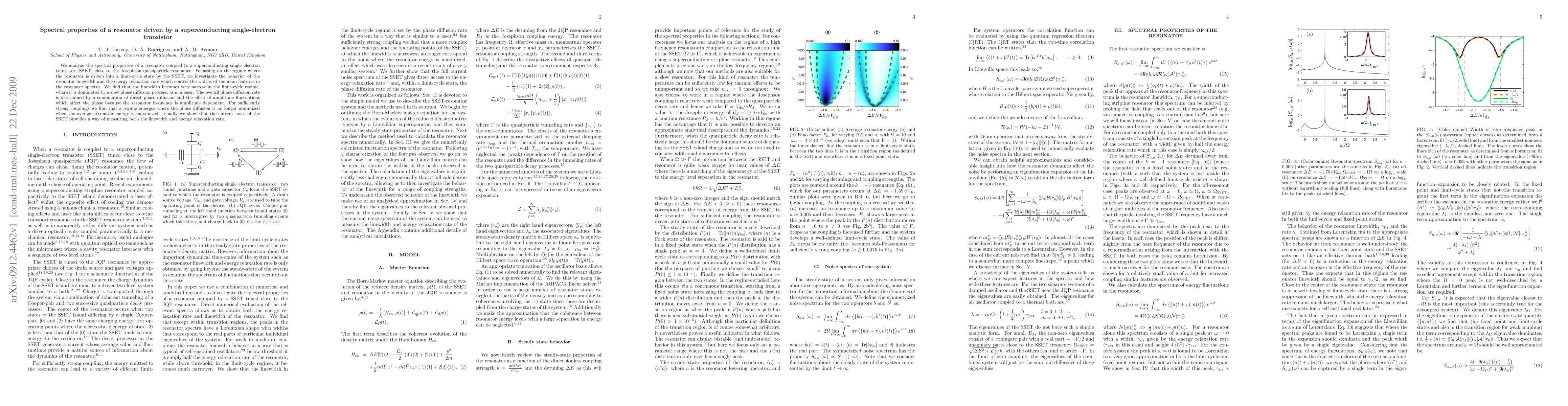 This paper investigates the spectral properties of a resonator driven by a superconducting single-electron transistor (SSET) near the Josephson quasiparticle resonance, finding that the resonator linewidth narrows significantly in a limit-cycle state dominated by slow phase diffusion. The current noise of the SSET is shown to measure both the linewidth and energy relaxation rate, revealing complex phase diffusion dynamics.