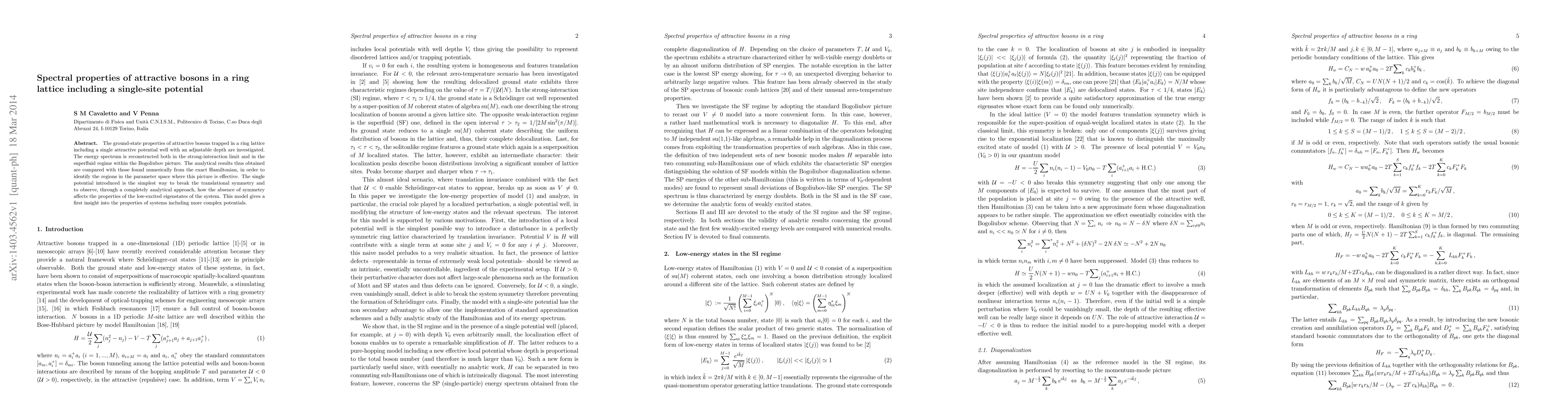 The ground-state properties of attractive bosons trapped in a ring lattice including a single attractive potential well with an adjustable depth are investigated. The energy spectrum is reconstructed both in the strong-interaction limit and in the superfluid regime within the Bogoliubov picture. The analytical results thus obtained are compared with those found numerically from the exact Hamiltonian, in order to identify the regions in the parameter space where this picture is effective. The single potential introduced is the simplest way to break the translational symmetry and to observe, through a completely analytical approach, how the absence of symmetry affects the properties of the low-excited eigenstates of the system. This model gives a first insight into the properties of systems including more complex potentials.
