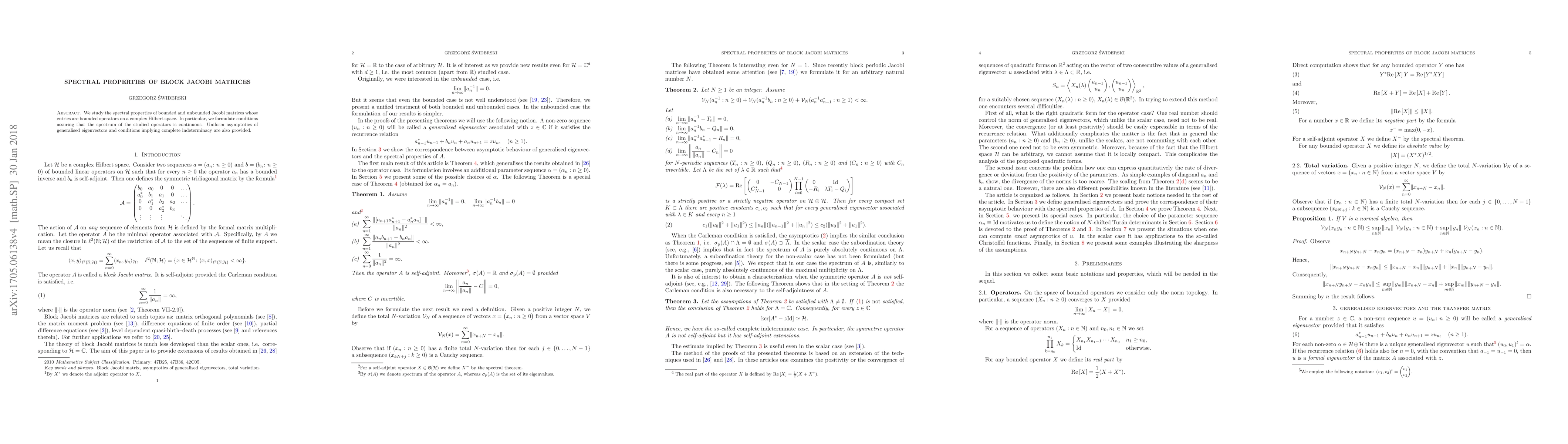 This paper investigates the spectral properties of Jacobi matrices with operator entries on a Hilbert space, focusing on conditions ensuring continuous spectra, and provides uniform asymptotics for generalized eigenvectors along with criteria for complete indeterminacy.