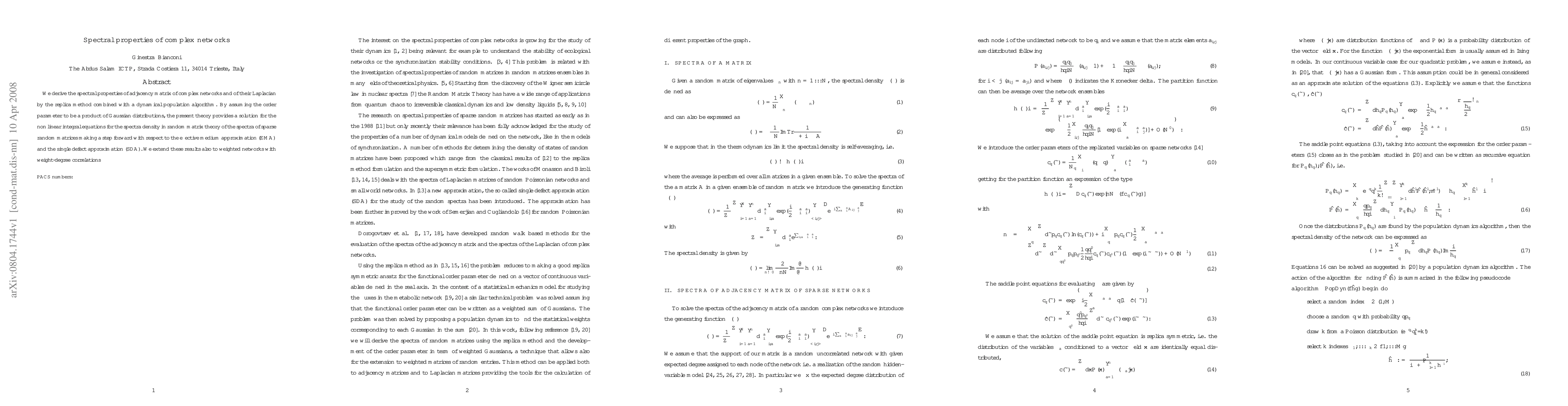 This paper derives the spectral properties of complex networks' adjacency matrices and Laplacians using the replica method and a dynamical population algorithm, offering a solution to nonlinear integral equations in random matrix theory. The approach improves upon the effective medium approximation and extends to weighted networks with weight-degree correlations.