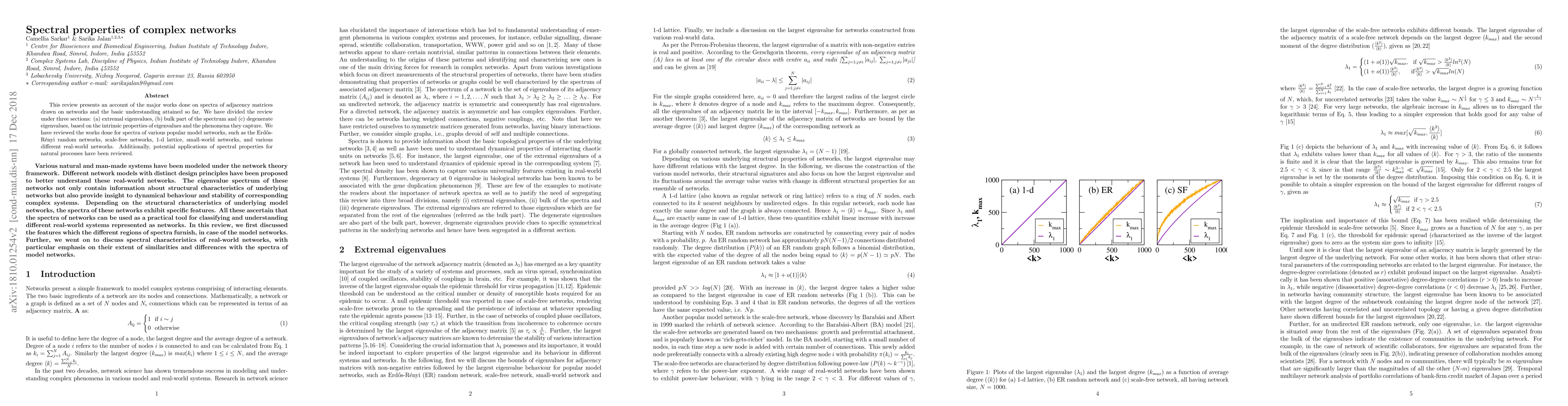 This paper reviews major studies on the spectra of adjacency matrices in complex networks, focusing on extremal, bulk, and degenerate eigenvalues. It covers various network models and discusses potential applications in natural processes.