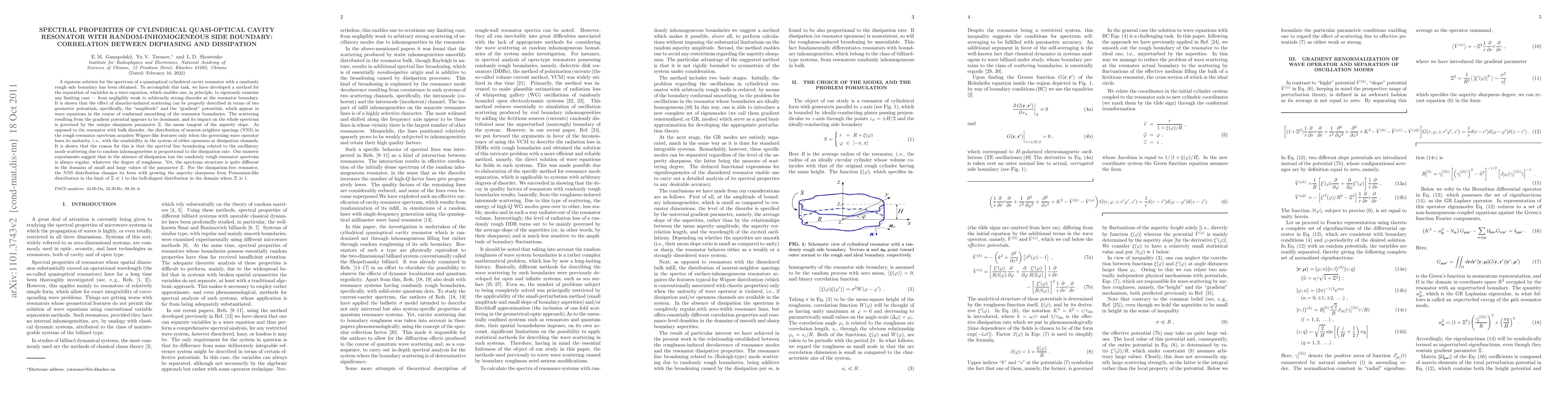 This paper presents a novel method for solving the spectrum of quasi-optical cylindrical cavity resonators with randomly rough boundaries, revealing that scattering is dominated by the gradient potential. The study finds that the spectrum's structure depends on the sharpness parameter $\Xi$, and the presence of dissipation is necessary for Wigner-like features in the distribution of nearest-neighbor spacings.