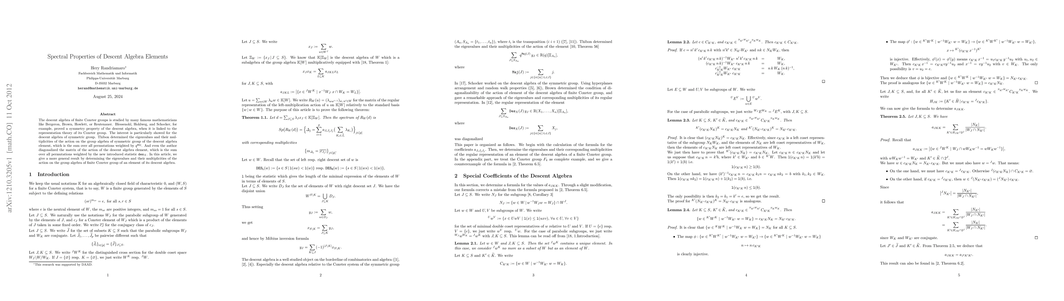 The descent algebra of finite Coxeter groups is studied by many famous mathematicians like Bergeron, Brown, Howlett, or Reutenauer. Blessenohl, Hohlweg, and Schocker, for example, proved a symmetry property of the descent algebra, when it is linked to the representation theory of its Coxeter group. The interest is particularly showed for the descent algebra of symmetric group. Thibon determined the eigenvalues and their multiplicities of the action on the group algebra of symmetric group of the descent algebra element, which is the sum over all permutations weighted by q^maj. And even the author diagonalized the matrix of the action of the descent algebra element, which is the sum over all permutations weighted by the new introduced statistic desX. In this article, we give a more general result by determining the eigenvalues and their multiplicities of the action on the group algebra of finite Coxeter group of an element of its descent algebra.