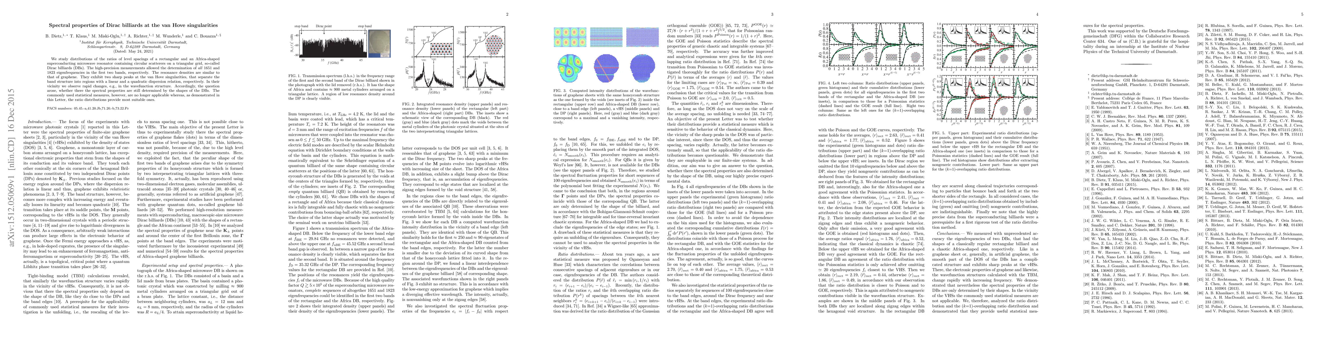 We study distributions of the ratios of level spacings of a rectangular and an Africa-shaped superconducting microwave resonator containing circular scatterers on a triangular grid, so-called Dirac billiards (DBs). The high-precision measurements allowed the determination of all 1651 and 1823 eigenfrequencies in the first two bands, respectively. The resonance densities are similar to that of graphene. They exhibit two sharp peaks at the van Hove singularities, that separate the band structure into regions with a linear and a quadratic dispersion relation, respectively. In their vicinity we observe rapid changes, e.g., in the wavefunction structure. Accordingly, the question arose, whether there the spectral properties are still determined by the shapes of the DBs. The commonly used statistical measures, however, are no longer applicable whereas, as demonstrated in this Letter, the ratio distributions provide most suitable ones.