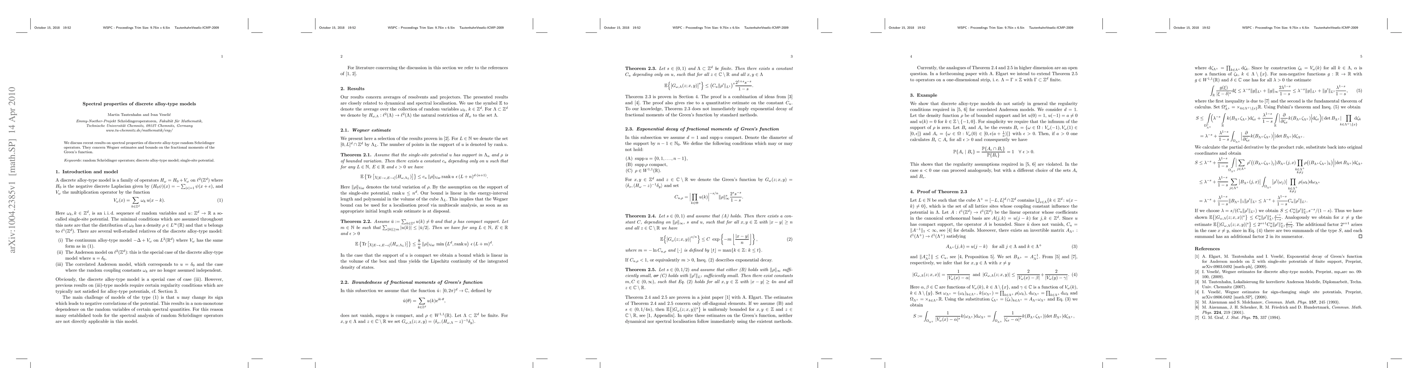 We discuss recent results on spectral properties of discrete alloy-type random Schr\"odinger operators. They concern Wegner estimates and bounds on the fractional moments of the Green's function.
