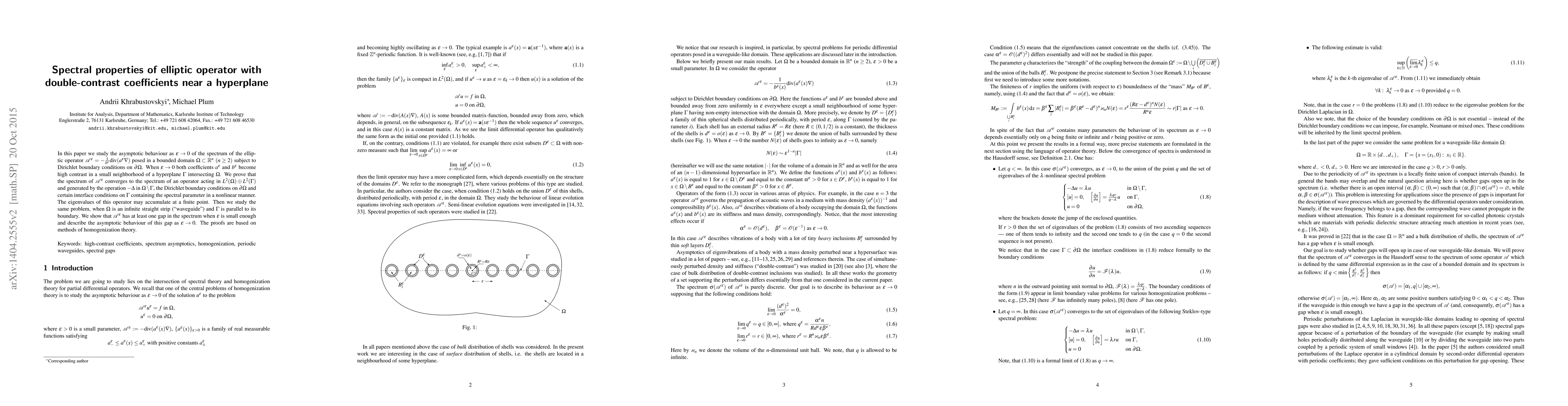 In this paper we study the asymptotic behaviour as $\varepsilon\to 0$ of the spectrum of the elliptic operator $\mathcal{A}^\varepsilon=-{1\over b^\varepsilon}\mathrm{div}(a^\varepsilon\nabla)$ posed in a bounded domain $\Omega\subset\mathbb{R}^n$ $(n \geq 2)$ subject to Dirichlet boundary conditions on $\partial\Omega$. When $\varepsilon\to 0$ both coefficients $a^\varepsilon$ and $b^\varepsilon$ become high contrast in a small neighborhood of a hyperplane $\Gamma$ intersecting $\Omega$. We prove that the spectrum of $\mathcal{A}^\varepsilon$ converges to the spectrum of an operator acting in $L^2(\Omega)\oplus L^2(\Gamma)$ and generated by the operation $-\Delta$ in $\Omega\setminus\Gamma$, the Dirichlet boundary conditions on $\partial\Omega$ and certain interface conditions on $\Gamma$ containing the spectral parameter in a nonlinear manner. The eigenvalues of this operator may accumulate at a finite point. Then we study the same problem, when $\Omega$ is an infinite straight strip ("waveguide") and $\Gamma$ is parallel to its boundary. We show that $\mathcal{A}^\varepsilon$ has at least one gap in the spectrum when $\varepsilon$ is small enough and describe the asymptotic behaviour of this gap as $\varepsilon\to 0$. The proofs are based on methods of homogenization theory.