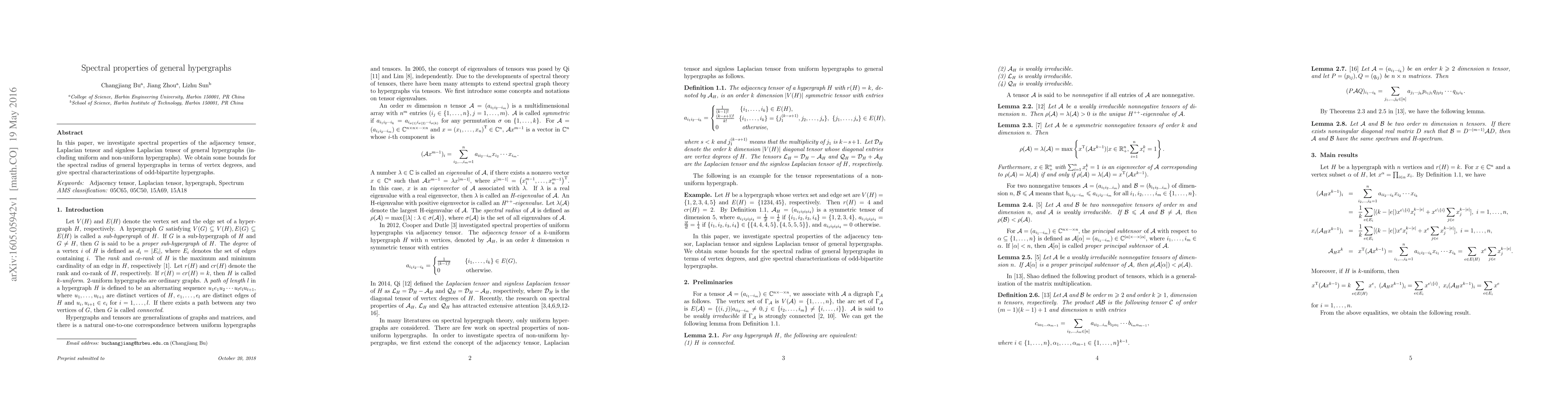 This paper explores spectral properties of tensors in general hypergraphs, deriving bounds for the spectral radius in terms of vertex degrees and providing spectral characterizations for odd-bipartite hypergraphs. The focus is on adjacency, Laplacian, and signless Laplacian tensors.