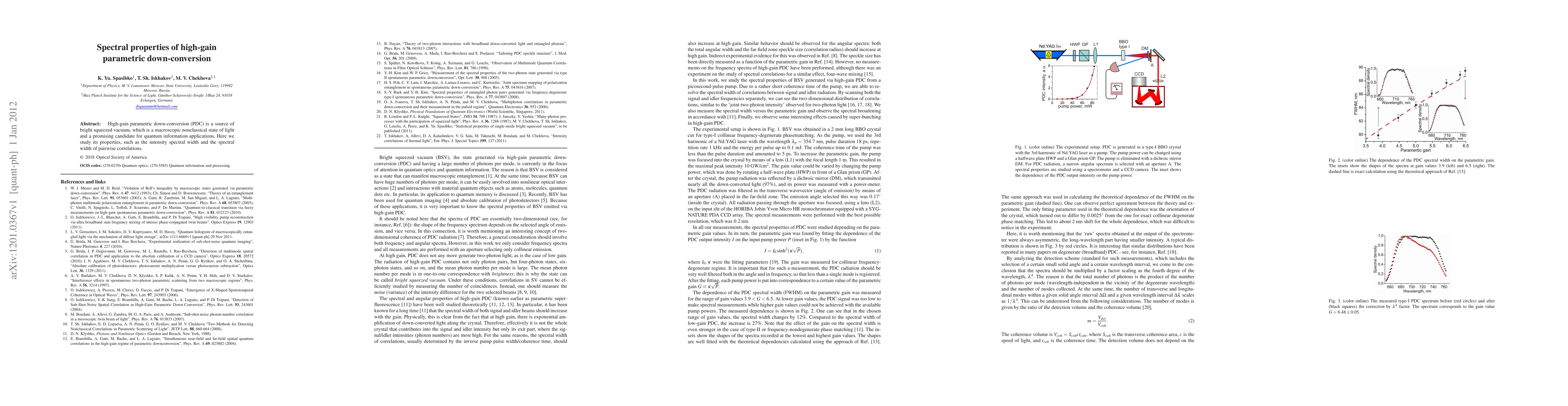 High-gain parametric down-conversion (PDC) is a source of bright squeezed vacuum, which is a macroscopic nonclassical state of light and a promising candidate for quantum information applications. Here we study its properties, such as the intensity spectral width and the spectral width of pairwise correlations.