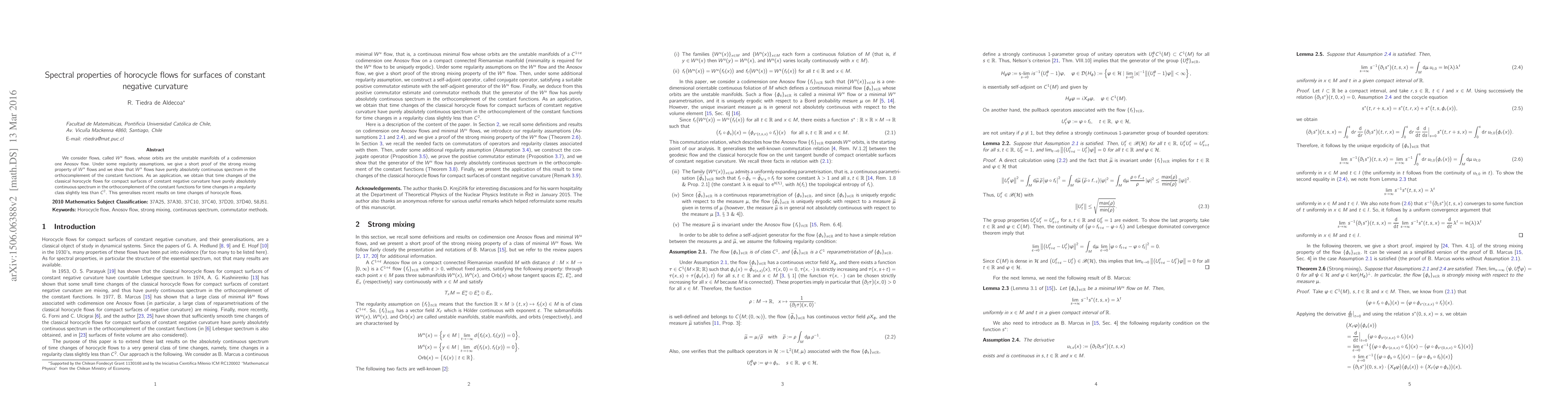 We consider flows, called $W^{\rm u}$ flows, whose orbits are the unstable manifolds of a codimension one Anosov flow. Under some regularity assumptions, we give a short proof of the strong mixing property of $W^{\rm u}$ flows and we show that $W^{\rm u}$ flows have purely absolutely continuous spectrum in the orthocomplement of the constant functions. As an application, we obtain that time changes of the classical horocycle flows for compact surfaces of constant negative curvature have purely absolutely continuous spectrum in the orthocomplement of the constant functions for time changes in a regularity class slightly less than $C^2$. This generalises recent results on time changes of horocycle flows.