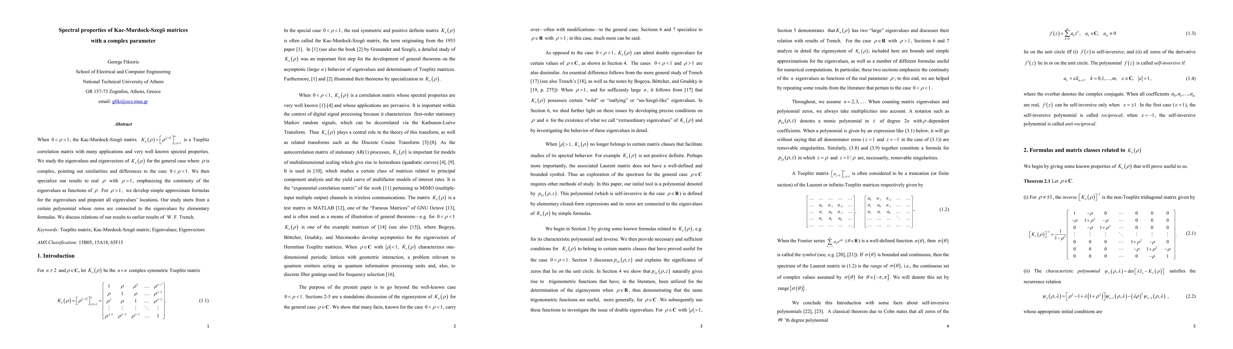 When $0\lt \rho \lt 1$, the Kac-Murdock-Szeg\"o matrix $K_n(\rho)=\left[\rho^{\lvert j-k \rvert}\right]_{j,k=1}^n$ is a Toeplitz correlation matrix with many applications and very well known spectral properties. We study the eigenvalues and eigenvectors of $K_n(\rho)$ for the general case where $\rho$ is complex, pointing out similarities and differences to the case $0\lt \rho \lt 1$. We then specialize our results to real $\rho$ with $\rho \gt 1$, emphasizing the continuity of the eigenvalues as functions of $\rho$. For $\rho \gt 1$, we develop simple approximate formulas for the eigenvalues and pinpoint all eigenvalues' locations. Our study starts from a certain polynomial whose zeros are connected to the eigenvalues by elementary formulas. We discuss relations of our results to earlier results of W. F. Trench.