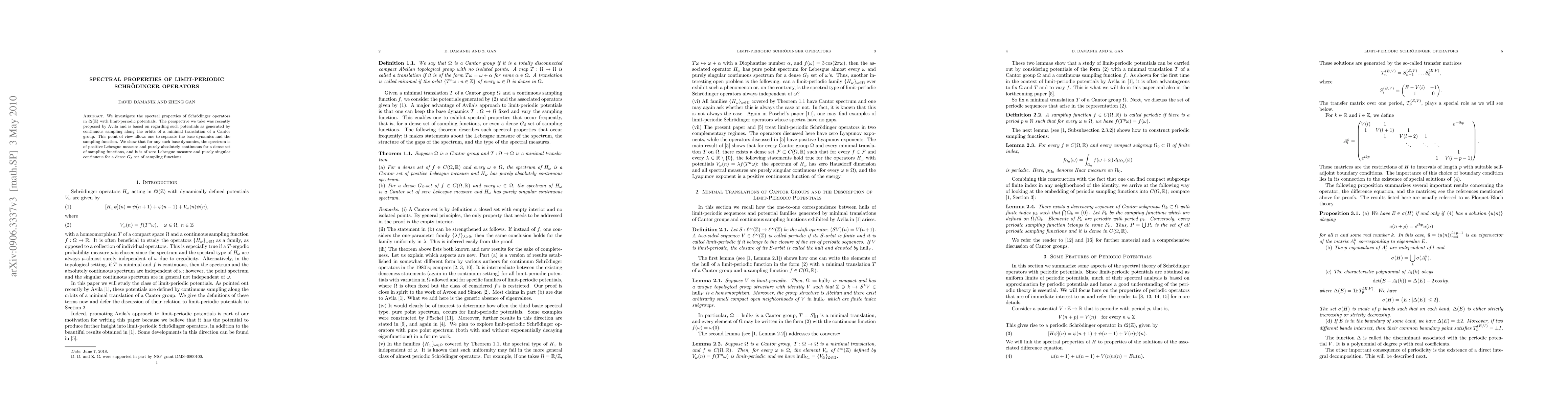 This paper explores the spectral properties of limit-periodic Schrödinger operators in l^2(Z) using a framework proposed by Avila, which separates base dynamics from sampling functions. It demonstrates that the spectrum is a Cantor set with positive Lebesgue measure and purely absolutely continuous for a dense set of sampling functions, and a Cantor set with zero Lebesgue measure and purely singular continuous for a dense G_\delta set of sampling functions.