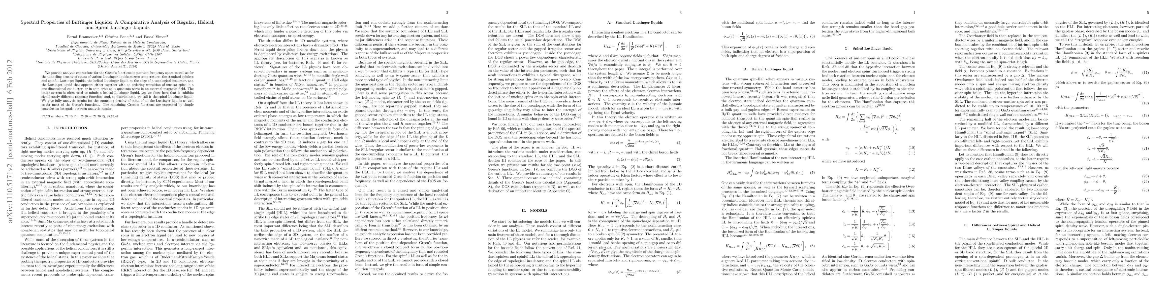 This research provides analytic expressions for the Green's functions and tunneling density of states of different Luttinger liquids, including standard, helical, and spiral types, highlighting significant differences, particularly between spiral and helical Luttinger liquids. Fully analytic results are given for most Green's functions and density of states.