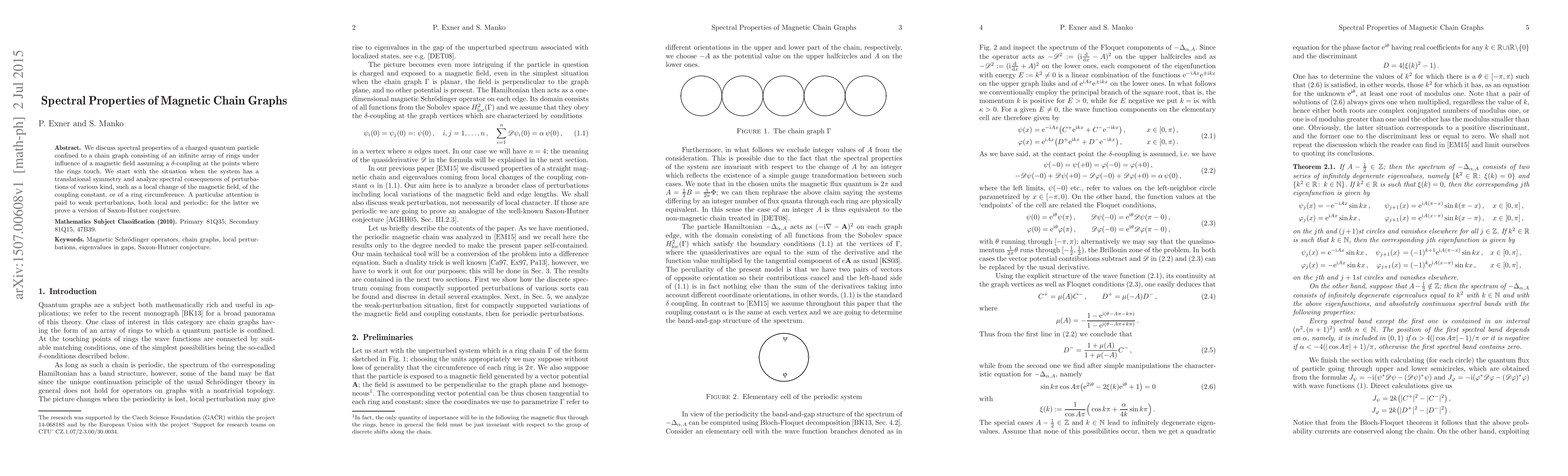 We discuss spectral properties of a charged quantum particle confined to a chain graph consisting of an infinite array of rings under influence of a magnetic field assuming a $\delta$-coupling at the points where the rings touch. We start with the situation when the system has a translational symmetry and analyze spectral consequences of perturbations of various kind, such as a local change of the magnetic field, of the coupling constant, or of a ring circumference. A particular attention is paid to weak perturbations, both local and periodic; for the latter we prove a version of Saxon-Hutner conjecture.
