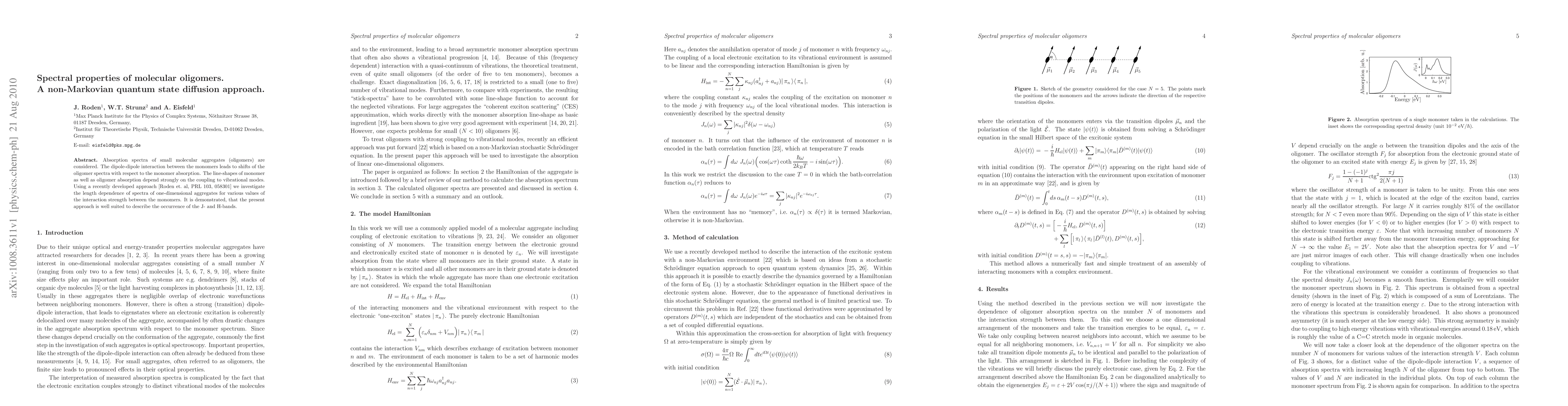 This paper investigates the absorption spectra of molecular oligomers using a non-Markovian quantum state diffusion approach, revealing how dipole-dipole interactions cause spectral shifts and shape changes due to coupling with vibrational modes. The study demonstrates the method's effectiveness in describing the emergence of J- and H-bands in one-dimensional aggregates.