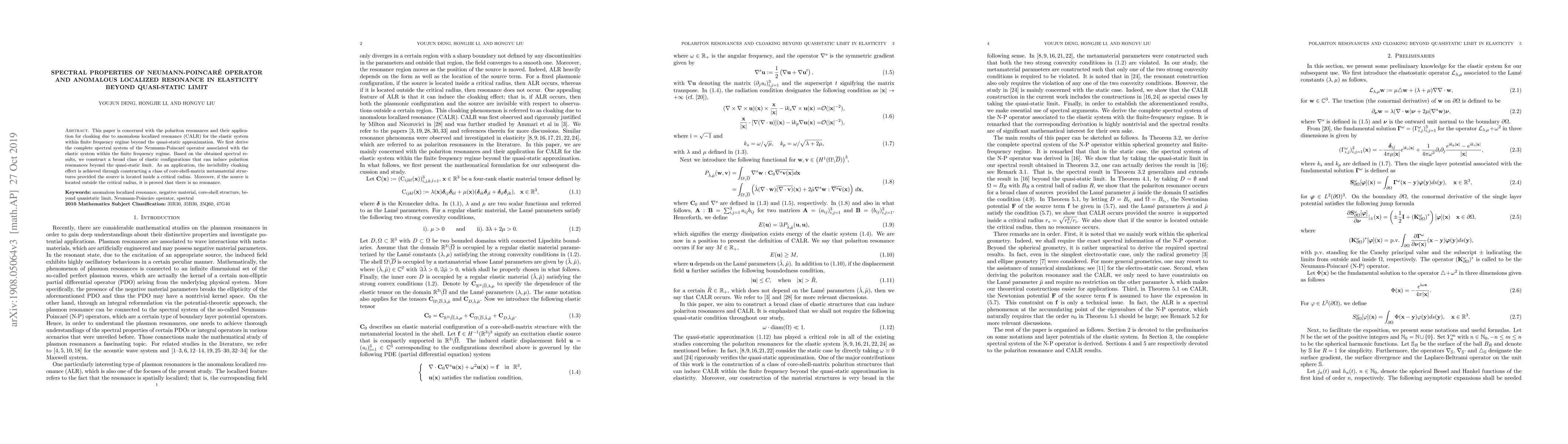 This paper derives the spectral properties of the Neumann-Poincaré operator for elastic systems beyond the quasi-static limit, and constructs metamaterials that exploit anomalous localized resonance for cloaking within a finite frequency regime. The study proves the invisibility cloaking effect for sources inside a critical radius and the absence of resonance for sources outside it.