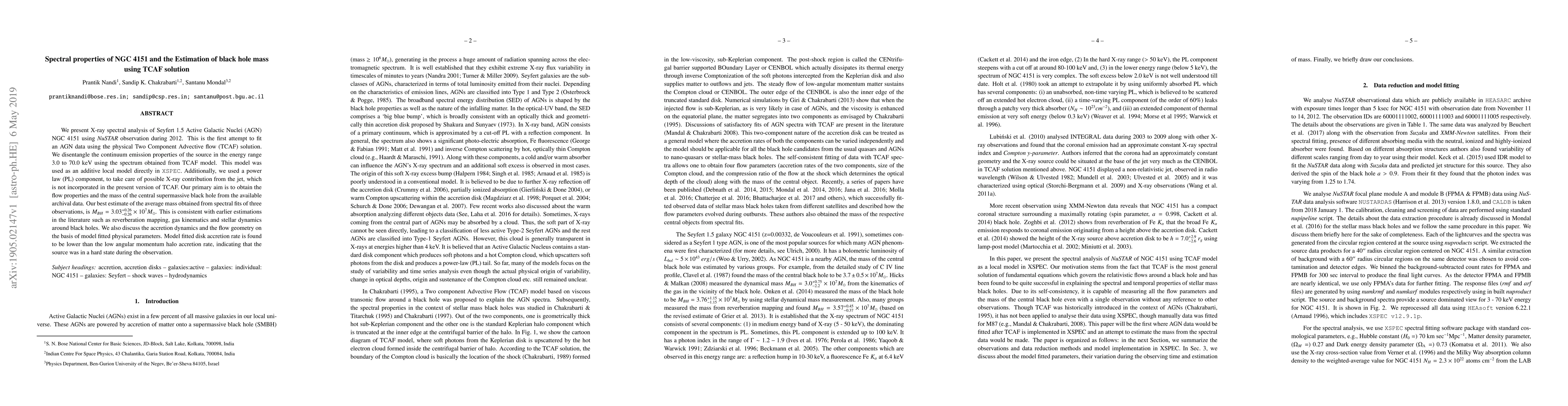 We present X-ray spectral analysis of Seyfert 1.5 Active Galactic Nuclei (AGN) NGC~4151 using \textit{NuSTAR} observation during 2012. This is the first attempt to fit an AGN data using the physical Two Component Advective flow (TCAF) solution. We disentangle the continuum emission properties of the source in the energy range $3.0$ to $70.0$~keV using the spectrum obtained from TCAF model. This model was used as an additive local model directly in {\fontfamily{qcr}\selectfont XSPEC}. Additionally, we used a power law (PL) component, to take care of possible X-ray contribution from the jet, which is not incorporated in the present version of TCAF. Our primary aim is to obtain the flow properties and the mass of the central supermassive black hole from the available archival data. Our best estimate of the average mass obtained from spectral fits of three observations, is $M_{BH}=3.03^{+0.26}_{-0.26}\times 10^7 M_\odot$. This is consistent with earlier estimations in the literature such as reverberation mapping, gas kinematics and stellar dynamics around black holes. We also discuss the accretion dynamics and the flow geometry on the basis of model fitted physical parameters. Model fitted disk accretion rate is found to be lower than the low angular momentum halo accretion rate, indicating that the source was in a hard state during the observation.