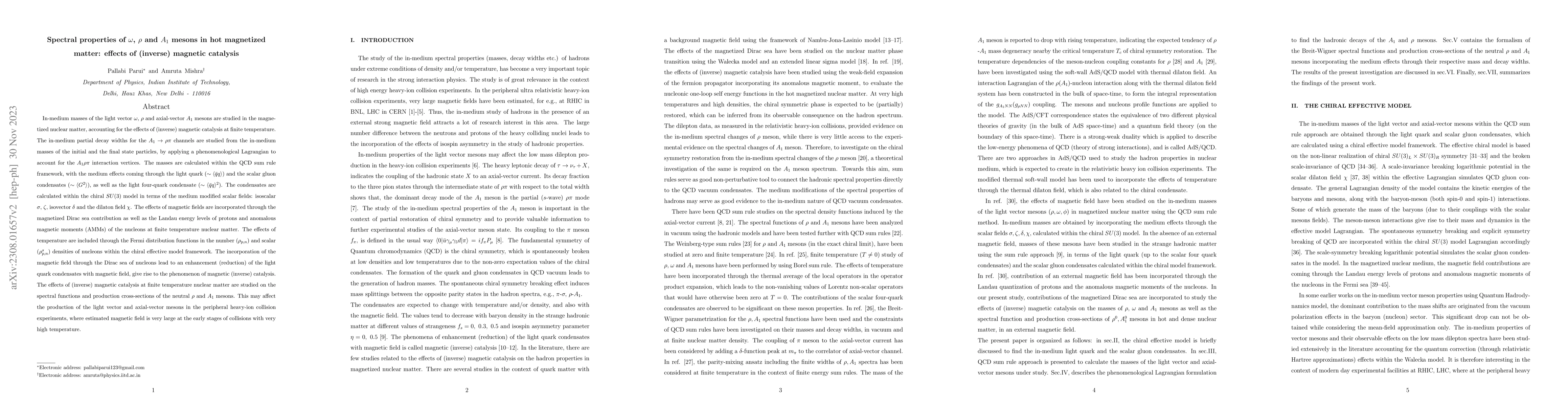 This paper investigates the spectral properties of $\omega$, $\rho$, and $A_1$ mesons in hot, magnetized nuclear matter, focusing on the effects of magnetic catalysis and inverse magnetic catalysis. The study uses QCD sum rules and the chiral $SU(3)$ model to account for medium modifications and magnetic field effects, revealing potential impacts on meson production in high-temperature heavy-ion collisions.