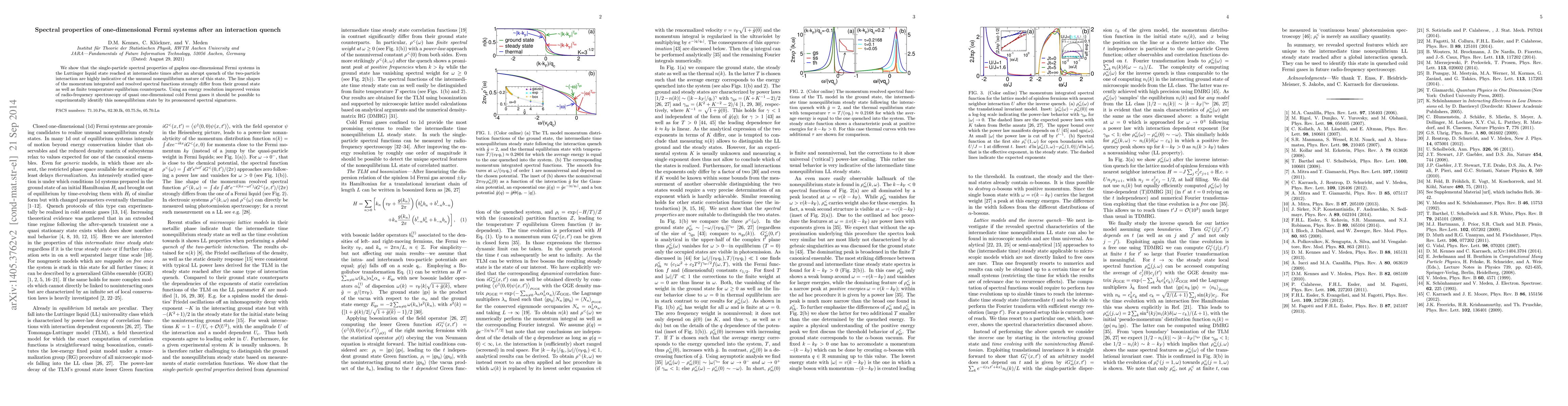 We show that the single-particle spectral properties of gapless one-dimensional Fermi systems in the Luttinger liquid state reached at intermediate times after an abrupt quench of the two-particle interaction are highly indicative of the unusual nonequilibrium nature of this state. The line shapes of the momentum integrated and resolved spectral functions strongly differ from their ground state as well as finite temperature equilibrium counterparts. Using an energy resolution improved version of radio-frequency spectroscopy of quasi one-dimensional cold Fermi gases it should be possible to experimentally identify this nonequilibrium state by its pronounced spectral signatures.