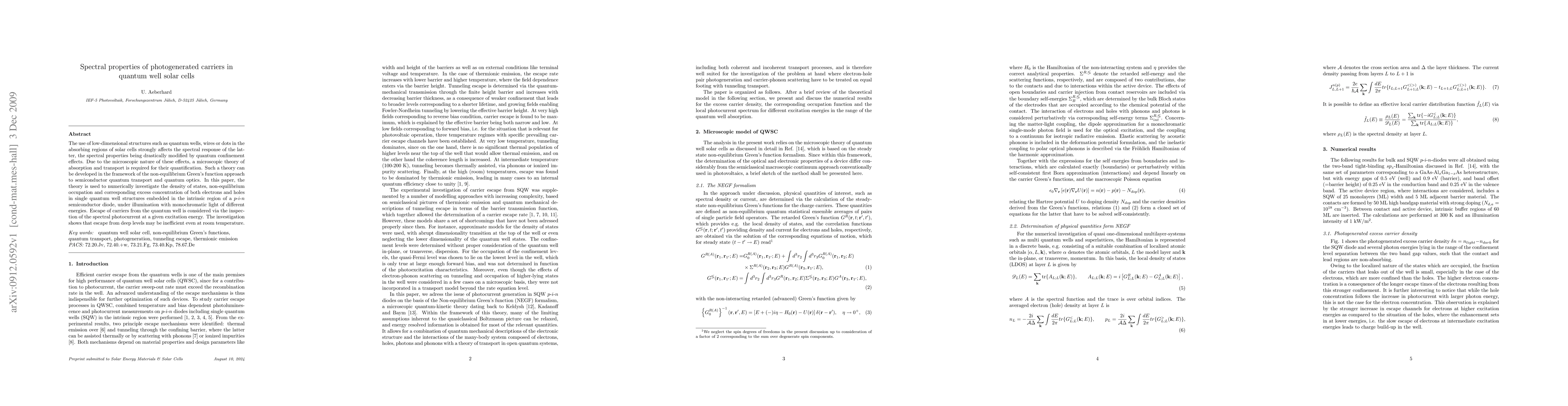 This paper uses non-equilibrium Green's function theory to analyze the spectral properties of carriers in quantum well solar cells, revealing that quantum confinement effects significantly modify spectral response and that carrier escape from deep levels can be inefficient at room temperature.
