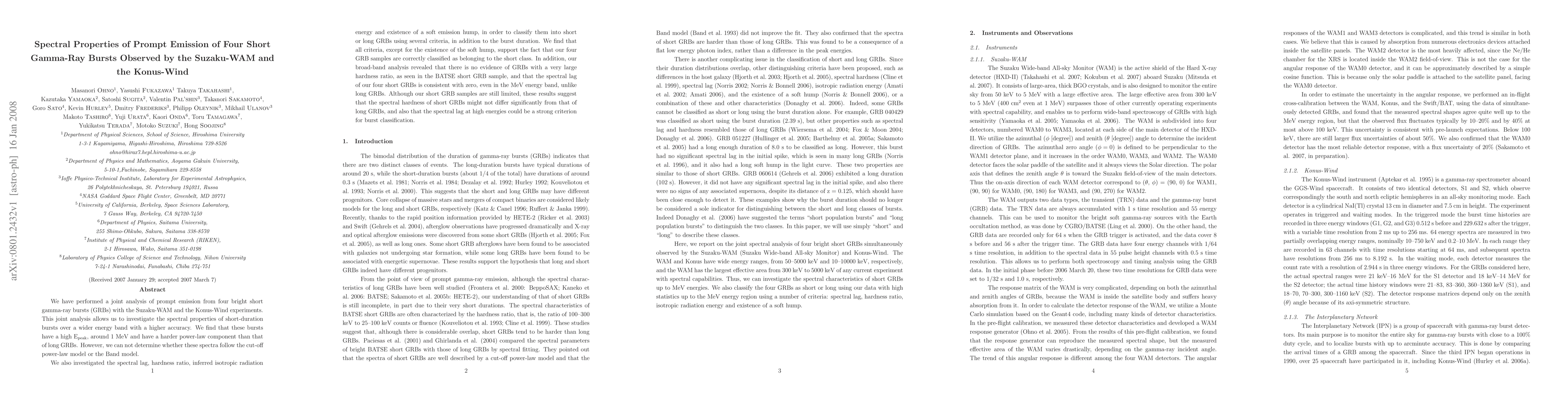 We have performed a joint analysis of prompt emission from four bright short gamma-ray bursts (GRBs) with the Suzaku-WAM and the Konus-Wind experiments. This joint analysis allows us to investigate the spectral properties of short-duration bursts over a wider energy band with a higher accuracy. We find that these bursts have a high E$_{\rm peak}$, around 1 MeV and have a harder power-law component than that of long GRBs. However, we can not determine whether these spectra follow the cut-off power-law model or the Band model. We also investigated the spectral lag, hardness ratio, inferred isotropic radiation energy and existence of a soft emission hump, in order to classify them into short or long GRBs using several criteria, in addition to the burst duration. We find that all criteria, except for the existence of the soft hump, support the fact that our four GRB samples are correctly classified as belonging to the short class. In addition, our broad-band analysis revealed that there is no evidence of GRBs with a very large hardness ratio, as seen in the BATSE short GRB sample, and that the spectral lag of our four short GRBs is consistent with zero, even in the MeV energy band, unlike long GRBs. Although our short GRB samples are still limited, these results suggest that the spectral hardness of short GRBs might not differ significantly from that of long GRBs, and also that the spectral lag at high energies could be a strong criterion for burst classification.