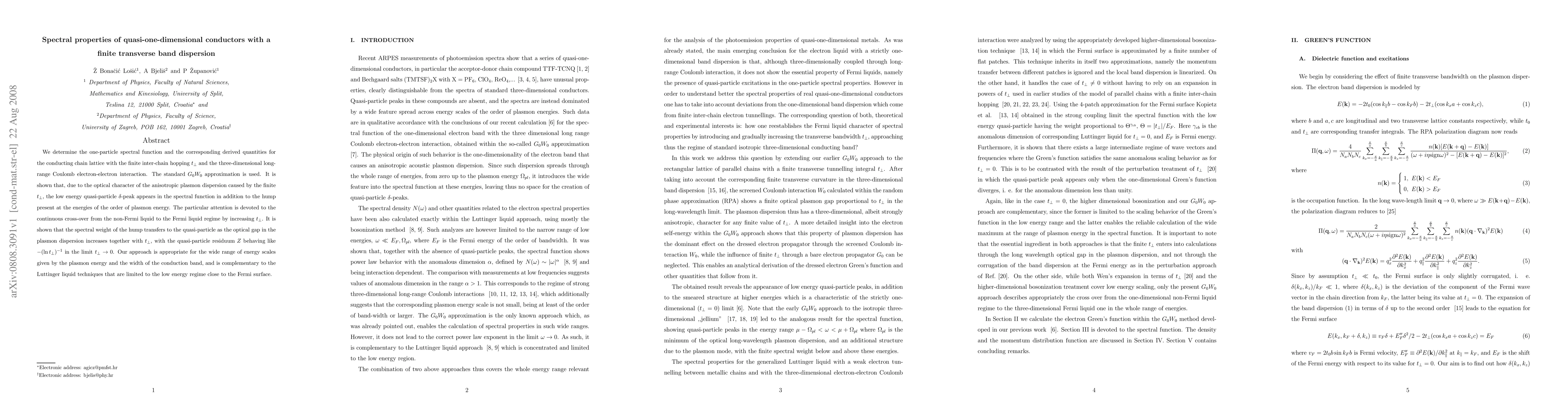 This paper investigates the spectral properties of quasi-one-dimensional conductors with finite transverse band dispersion, revealing a low-energy quasi-particle delta peak due to anisotropic plasmon dispersion. It demonstrates a continuous transition from non-Fermi to Fermi liquid behavior with increasing inter-chain hopping, showing that the quasi-particle residue inversely depends on the logarithm of the hopping parameter.