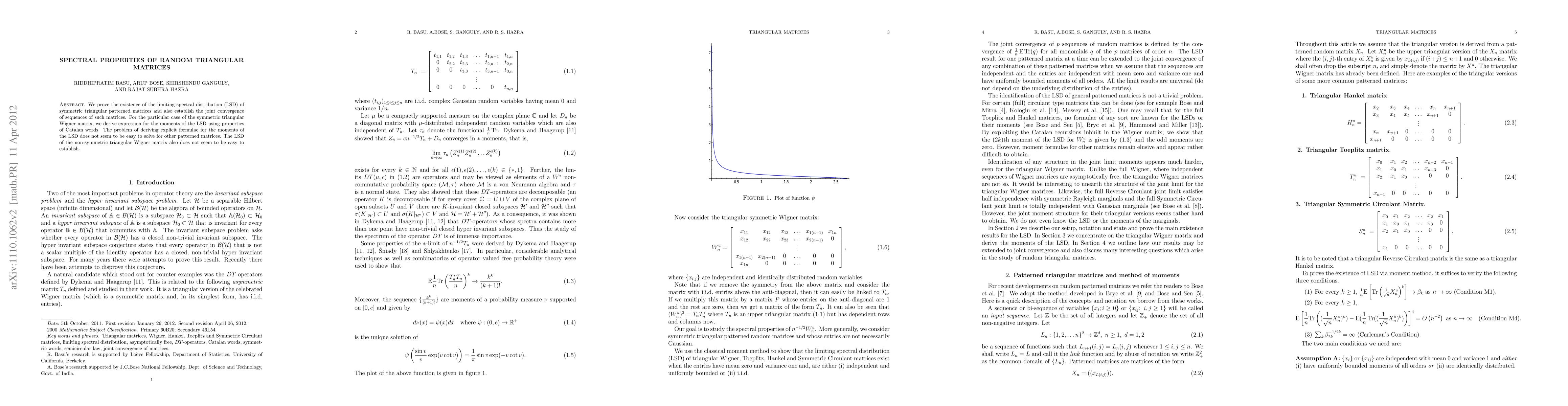 We prove the existence of the limiting spectral distribution (LSD) of symmetric triangular patterned matrices and also establish the joint convergence of sequences of such matrices. For the particular case of the symmetric triangular Wigner matrix, we derive expression for the moments of the LSD using properties of Catalan words. The problem of deriving explicit formulae for the moments of the LSD does not seem to be easy to solve for other patterned matrices. The LSD of the non-symmetric triangular Wigner matrix also does not seem to be easy to establish.