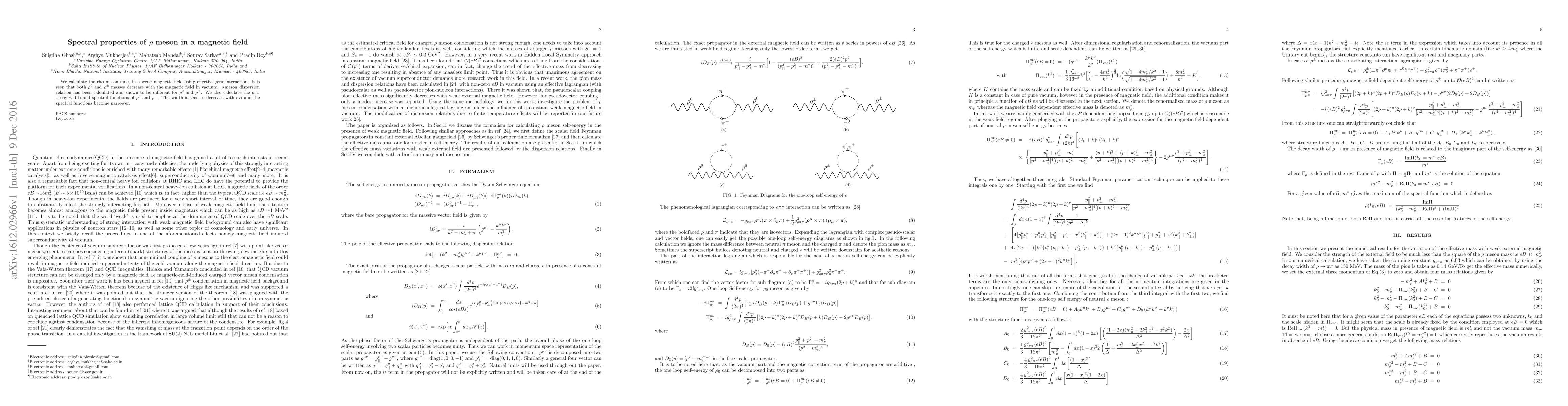 This paper investigates the spectral properties of $\rho$ mesons in a magnetic field, finding that both $\rho^0$ and $\rho^\pm$ masses decrease with increasing magnetic field strength. The $\rho$ meson dispersion relation differs for $\rho^0$ and $\rho^\pm$, and the $\rho\pi\pi$ decay width decreases with magnetic field, while the spectral functions become narrower.