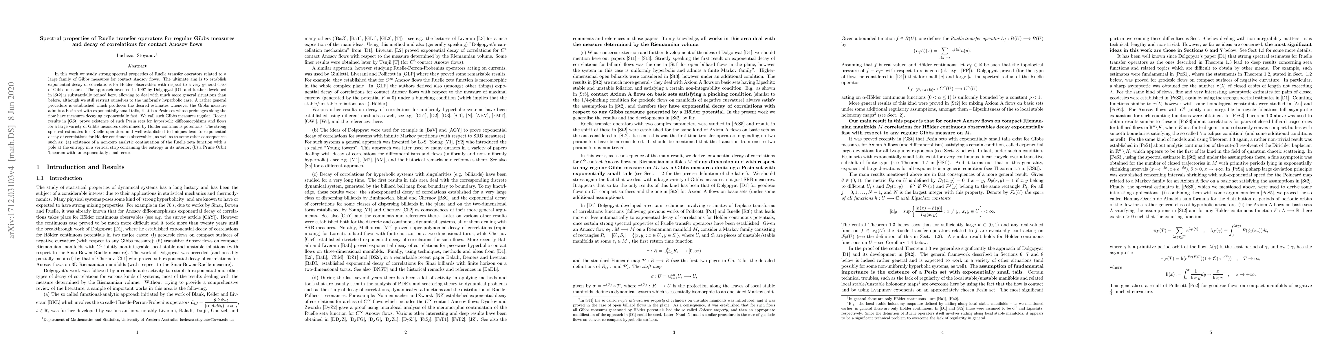 In this work we study strong spectral properties of Ruelle transfer operators related to a large family of Gibbs measures for contact Anosov flows. The ultimate aim is to establish exponential decay of correlations for H\"older observables with respect to a very general class of Gibbs measures. The approach invented in 1997 by Dolgopyat \cite{D1} and further developed in \cite{St2} is substantially refined here, allowing to deal with much more general situations than before, although we still restrict ourselves to the uniformly hyperbolic case. A rather general procedure is established which produces the desired estimates whenever the Gibbs measure admits a Pesin set with exponentially small tails, that is a Pesin set whose preimages along the flow have measures decaying exponentially fast. We call such Gibbs measures regular. Recent results in \cite{GSt} prove existence of such Pesin sets for hyperbolic diffeomorphisms and flows for a large variety of Gibbs measures determined by H\"older continuous potentials. The strong spectral estimates for Ruelle operators and well-established techniques lead to exponential decay of correlations for H\"older continuous observables, as well as to some other consequences such as: (a) existence of a non-zero analytic continuation of the Ruelle zeta function with a pole at the entropy in a vertical strip containing the entropy in its interior; (b) a Prime Orbit Theorem with an exponentially small error.