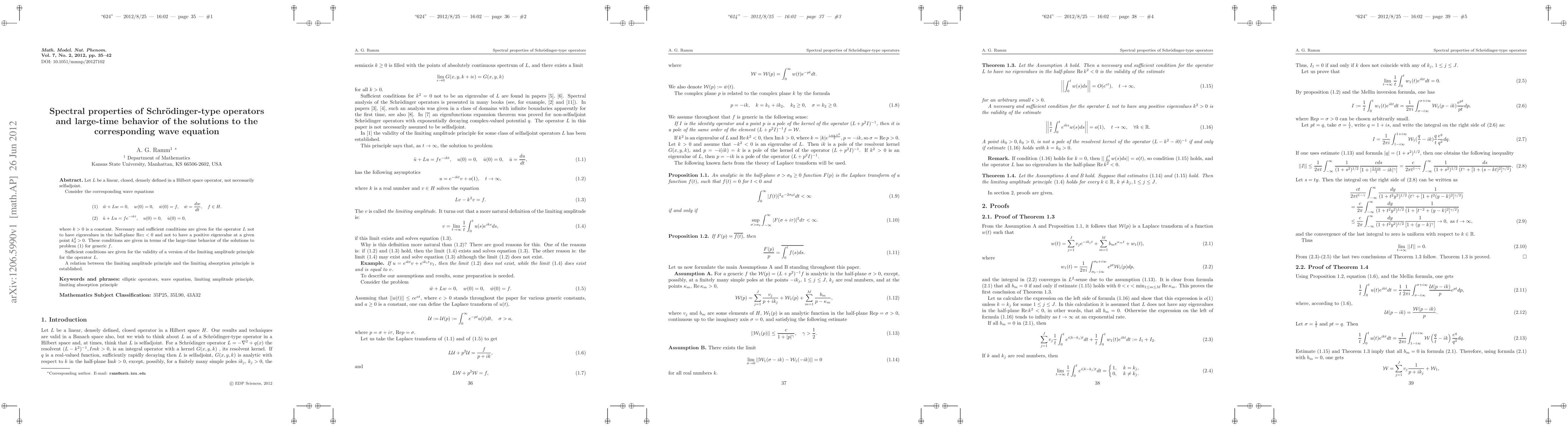 Let $L$ be a linear, closed, densely defined in a Hilbert space operator, not necessarily selfadjoint. Consider the corresponding wave equations &(1) \quad \ddot{w}+ Lw=0, \quad w(0)=0,\quad \dot{w}(0)=f, \quad \dot{w}=\frac{dw}{dt}, \quad f \in H. &(2) \quad \ddot{u}+Lu=f e^{-ikt}, \quad u(0)=0, \quad \dot{u}(0)=0, where $k>0$ is a constant. Necessary and sufficient conditions are given for the operator $L$ not to have eigenvalues in the half-plane Re$z<0$ and not to have a positive eigenvalue at a given point $k_d^2 >0$. These conditions are given in terms of the large-time behavior of the solutions to problem (1) for generic $f$. Sufficient conditions are given for the validity of a version of the limiting amplitude principle for the operator $L$. A relation between the limiting amplitude principle and the limiting absorption principle is established.