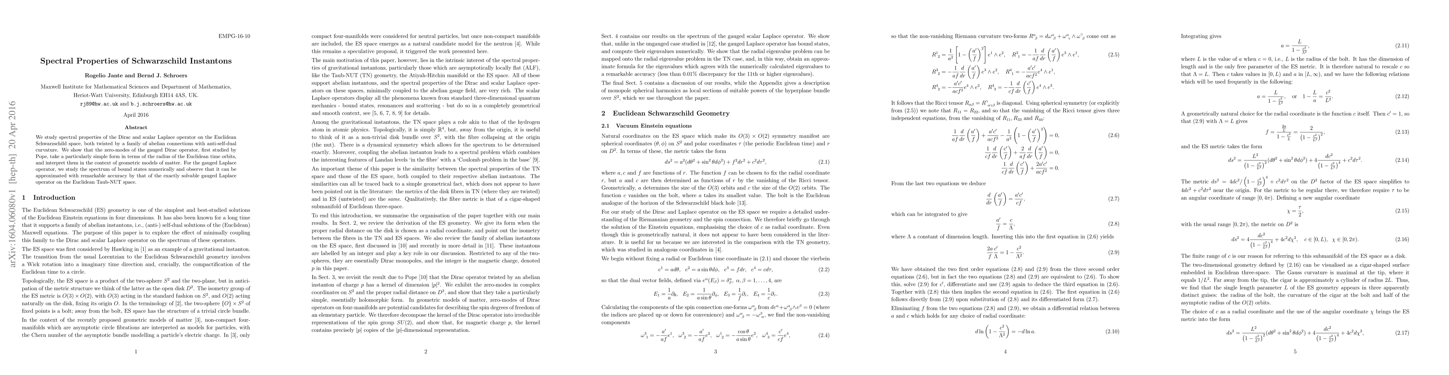 We study spectral properties of the Dirac and scalar Laplace operator on the Euclidean Schwarzschild space, both twisted by a family of abelian connections with anti-self-dual curvature. We show that the zero-modes of the gauged Dirac operator, first studied by Pope, take a particularly simple form in terms of the radius of the Euclidean time orbits, and interpret them in the context of geometric models of matter. For the gauged Laplace operator, we study the spectrum of bound states numerically and observe that it can be approximated with remarkable accuracy by that of the exactly solvable gauged Laplace operator on the Euclidean Taub-NUT space.