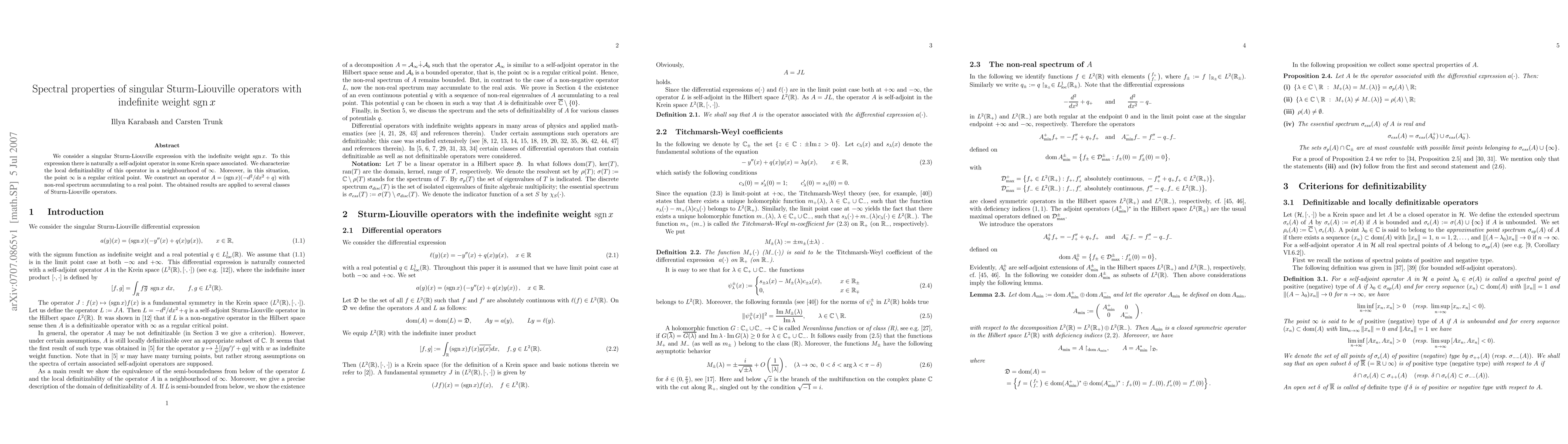 This paper studies the spectral properties of singular Sturm-Liouville operators with an indefinite weight function sgn x, showing the local definitizability and constructing an operator with a non-real spectrum. Applications to various Sturm-Liouville classes are also discussed.