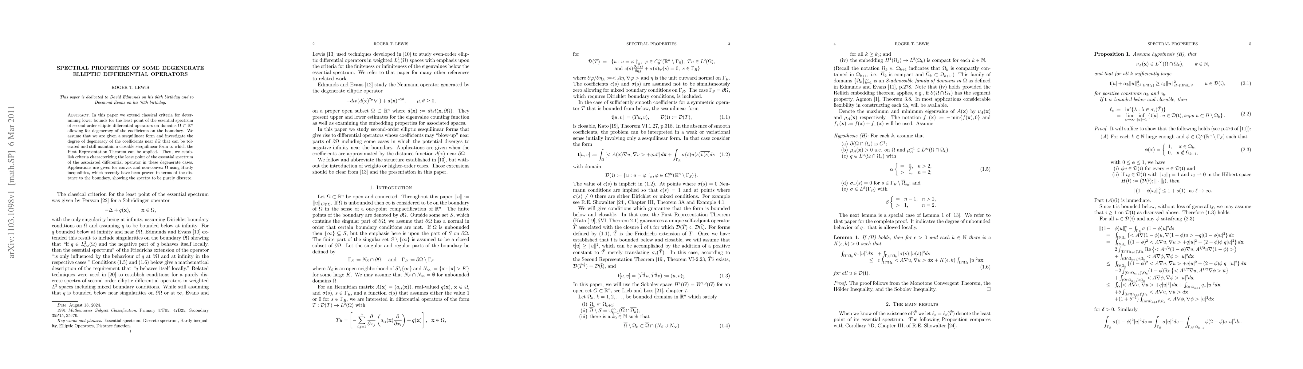 In this paper we extend classical criteria for determining lower bounds for the least point of the essential spectrum of second-order elliptic differential operators on domains $\Omega\subset\R^n$ allowing for degeneracy of the coefficients on the boundary. We assume that we are given a sesquilinear form and investigate the degree of degeneracy of the coefficients near $\partial\Omega$ that can be tolerated and still maintain a closable sesquilinear form to which the First Representation Theorem can be applied. Then, we establish criteria characterizing the least point of the essential spectrum of the associated differential operator in these degenerate cases. Applications are given for convex and non-convex $\Omega$ using Hardy inequalities, which recently have been proven in terms of the distance to the boundary, showing the spectra to be purely discrete.