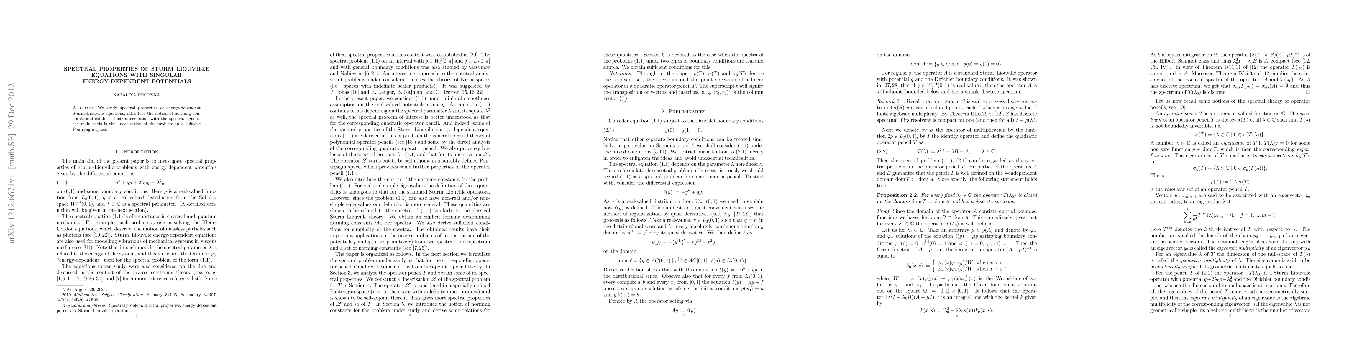 This paper investigates the spectral properties of Sturm-Liouville equations with singular, energy-dependent potentials, introducing norming constants and establishing their relationship with the spectra. The study employs linearization techniques in a Pontryagin space as a key analytical tool.