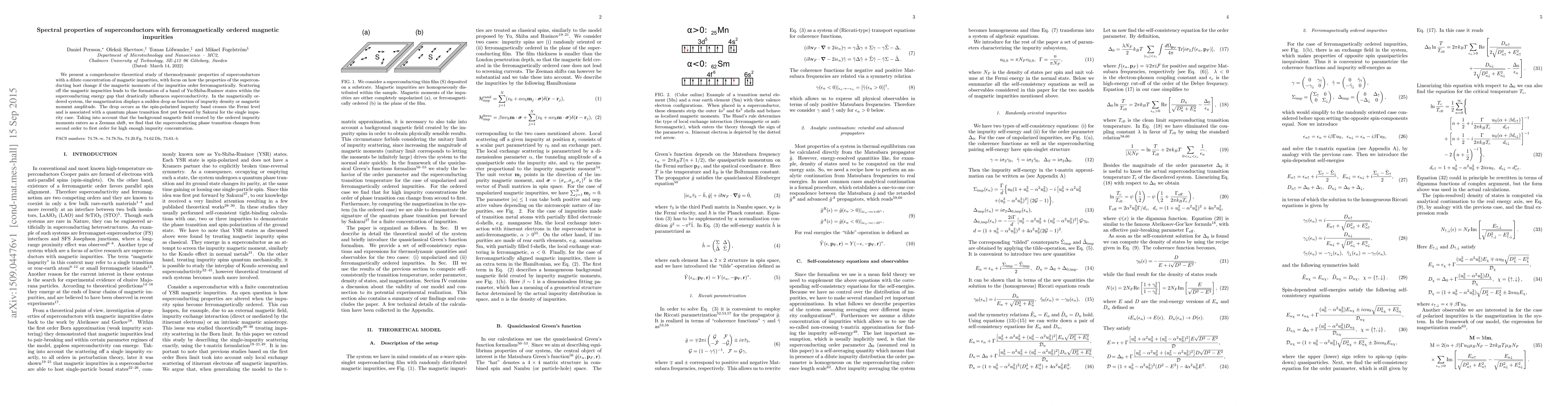 This study explores how ferromagnetic ordering in magnetic impurities within superconductors impacts thermodynamic properties. It reveals that as impurity density increases, magnetization drops due to a quantum phase transition, linked to the crossing of a spin-polarized impurity band through the Fermi level. The research also finds that the superconducting phase transition shifts from second to first order with high enough impurity concentration, influenced by the background magnetic field.