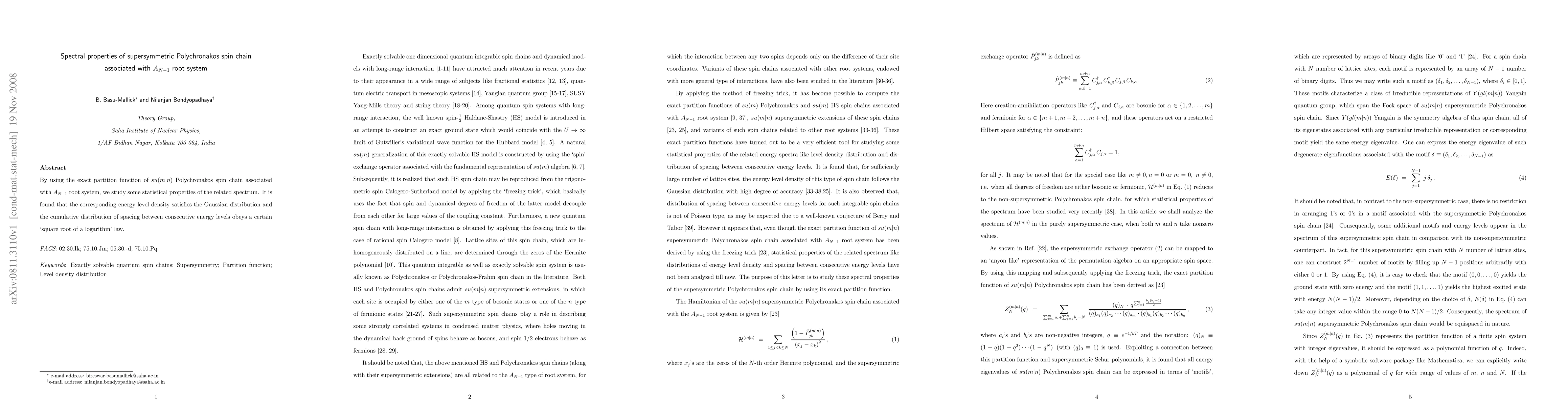 This paper investigates the spectral properties of the supersymmetric Polychronakos spin chain linked to the A_{N-1} root system, revealing that the energy level density follows a Gaussian distribution and the spacing between consecutive energy levels adheres to a 'square root of a logarithm' law.
