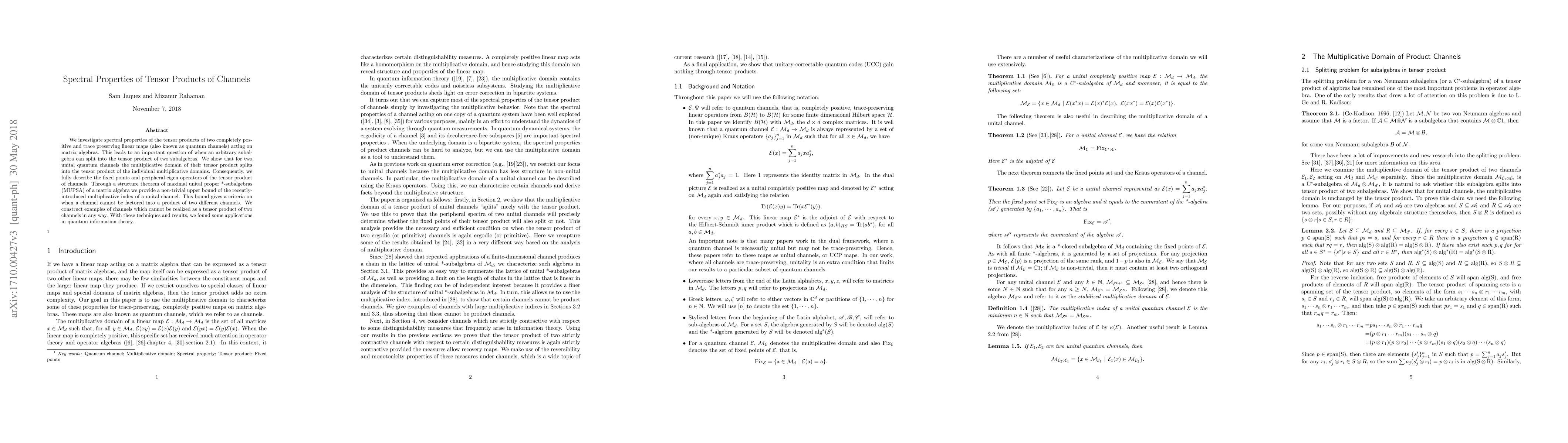 This paper investigates the spectral properties of tensor products of quantum channels, showing that their multiplicative domains can split into individual subalgebras and providing a criteria for when a channel cannot be factored into two different channels.