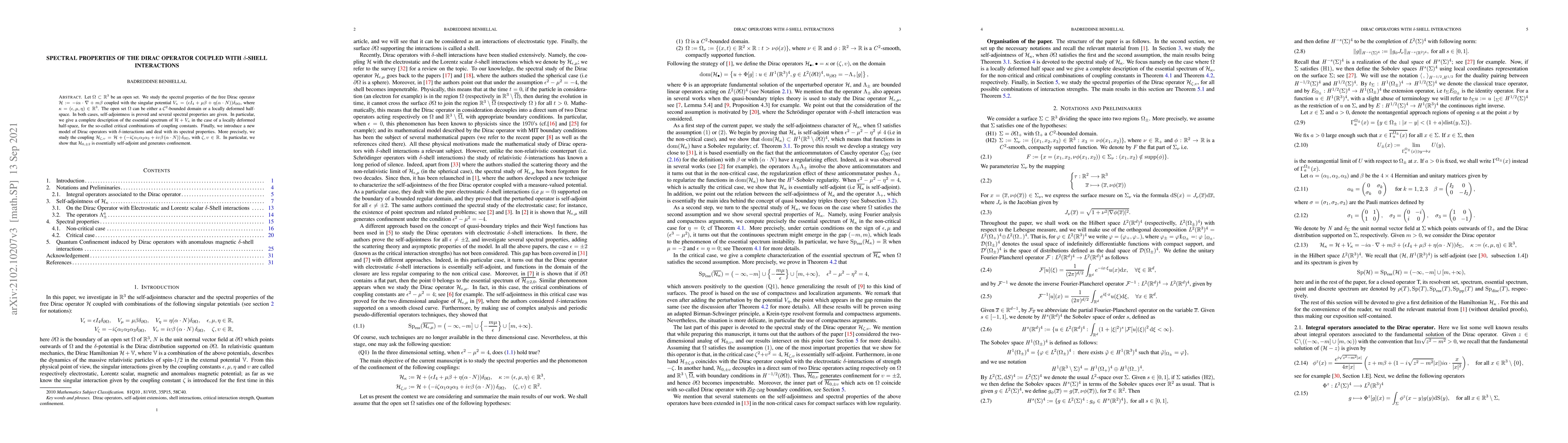 This paper investigates the spectral properties of the Dirac operator coupled with $\delta$-shell interactions, proving self-adjointness and describing the essential spectrum for specific coupling constants. It also introduces a new model of Dirac operators with $\delta$-interactions, demonstrating that $\mathcal{H}_{\pm2}$ is essentially self-adjoint and generates confinement.