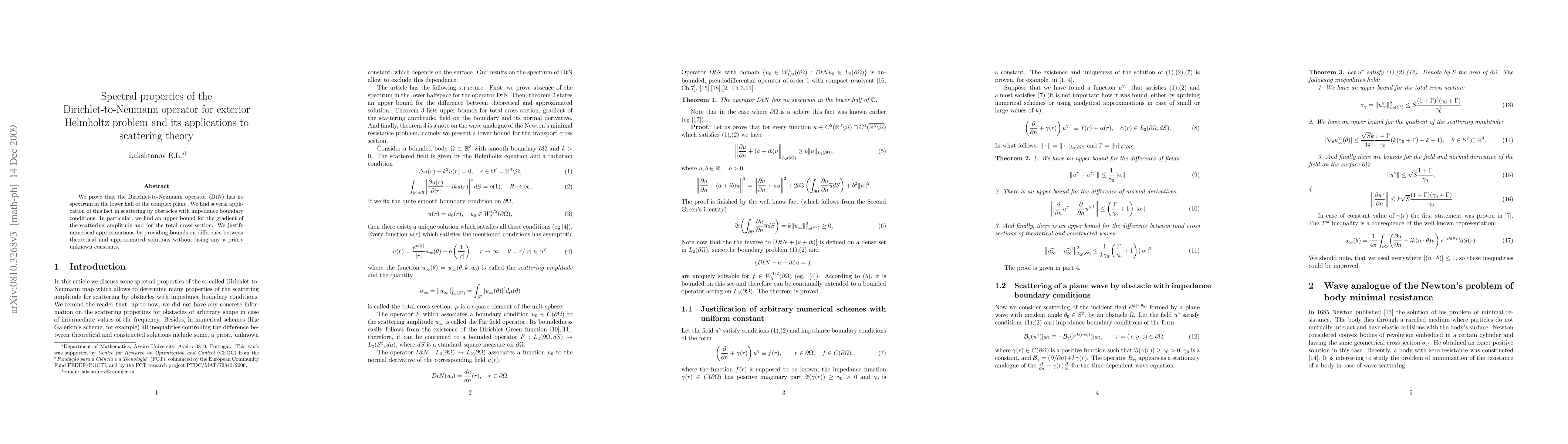 We prove that the Dirichlet-to-Neumann operator (DtN) has no spectrum in the lower half of the complex plane. We find several application of this fact in scattering by obstacles with impedance boundary conditions. In particular, we find an upper bound for the gradient of the scattering amplitude and for the total cross section. We justify numerical approximations by providing bounds on difference between theoretical and approximated solutions without using any a priory unknown constants.