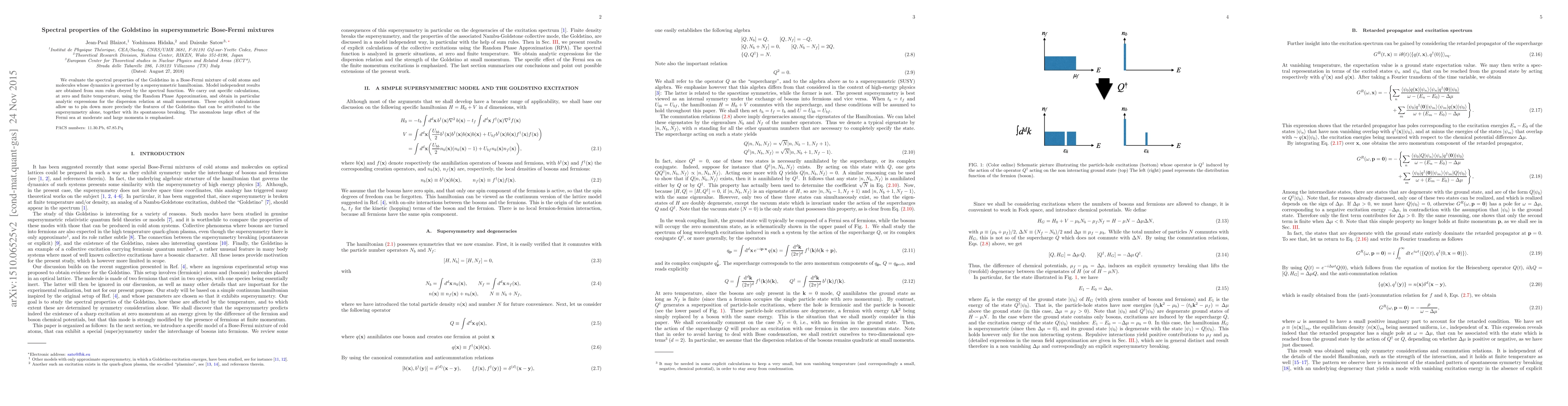 This paper evaluates the spectral properties of the Goldstino in supersymmetric Bose-Fermi mixtures, deriving model-independent results from sum rules and specific calculations using the Random Phase Approximation. It highlights the effects of supersymmetry and its spontaneous breaking, and notes the significant influence of the Fermi sea at higher momenta.