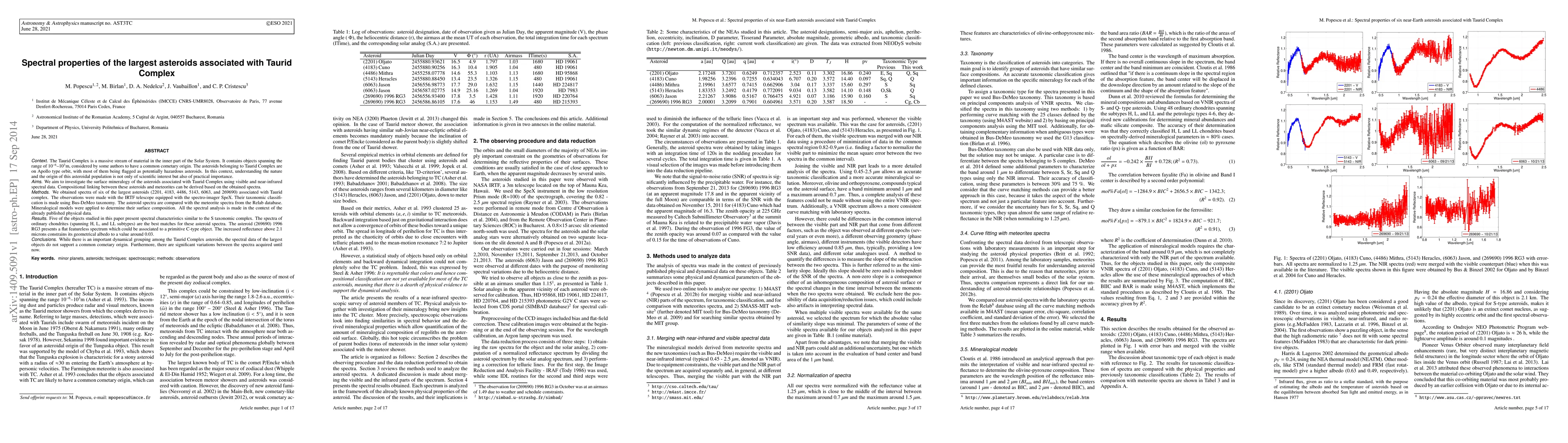 The study of six large asteroids in the Taurid complex reveals that five have similar spectral characteristics to ordinary chondrites, while one has a flat featureless spectrum suggesting a primitive C-type object.