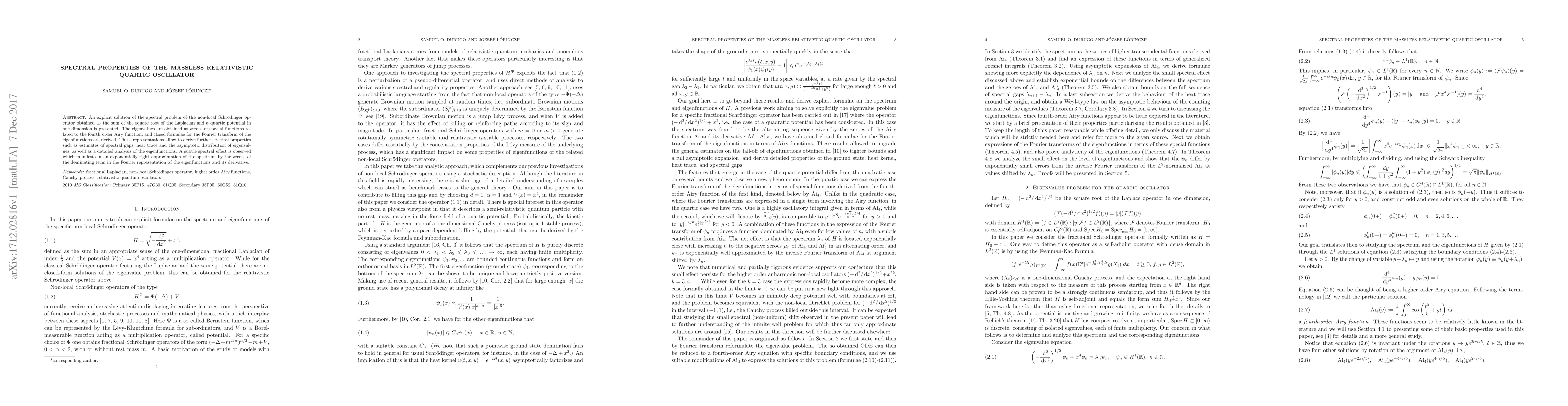 Researchers solved a complex math problem involving a special type of quantum particle called the massless relativistic quartic oscillator, finding a way to calculate its energy levels using special functions related to the Airy function and deriving closed formulae for its eigenfunctions.