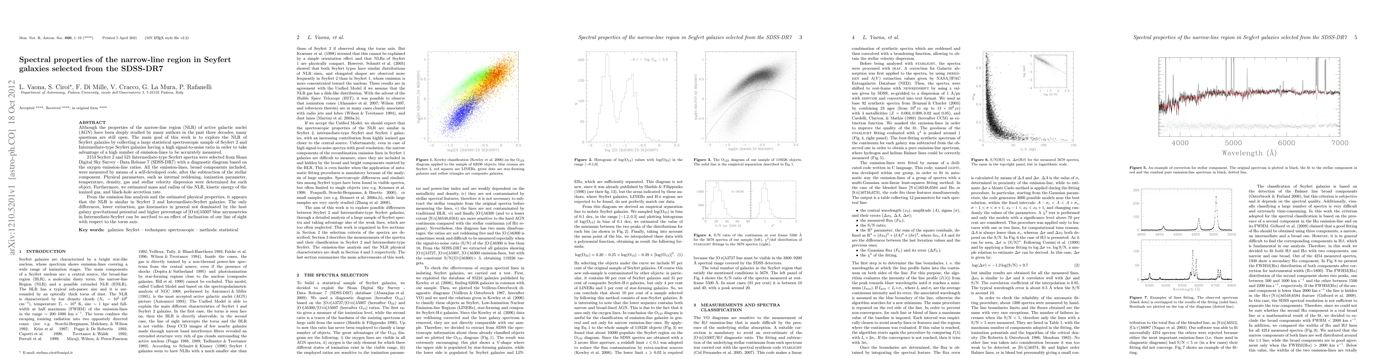 This paper investigates the spectral properties of the narrow-line region (NLR) in Seyfert galaxies selected from SDSS-DR7, analyzing 2153 Seyfert 2 and 521 Intermediate-type Seyfert galaxies. It finds that the NLR exhibits similar characteristics across both types, with differences likely due to observational inclination effects.
